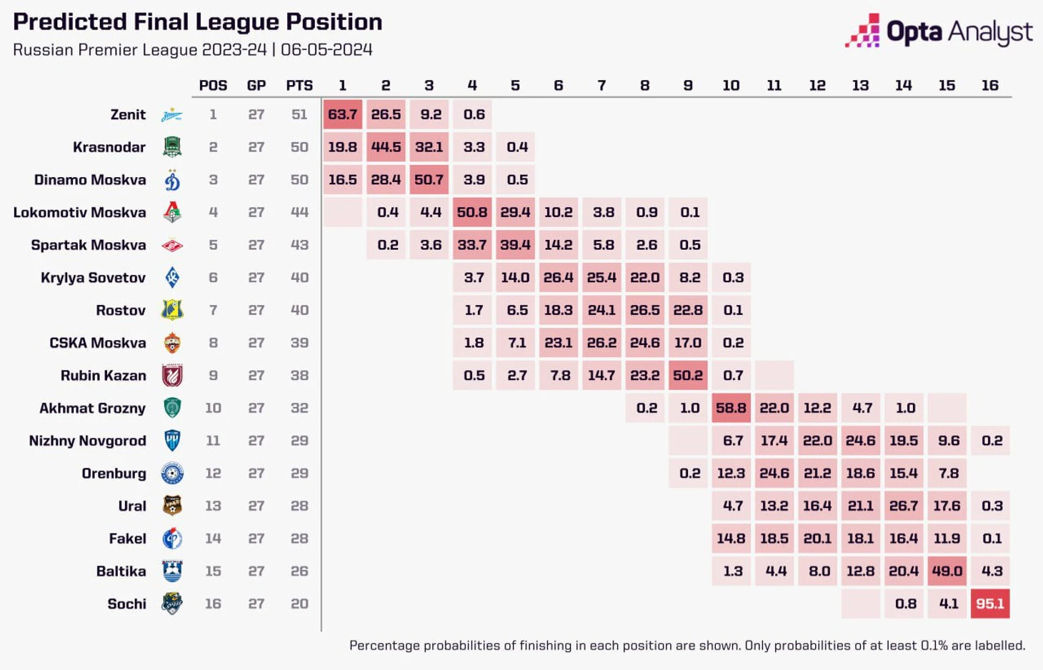 ● С «Сочи» почти все понятно, по цифрам Opta фаворит на 15-е место – «Балтика». Дальше все очень запутанно: «Уралу» дают больше шансов на стыки, чем на спасение, «Факел» вполне может вылезти из опасной зоны.