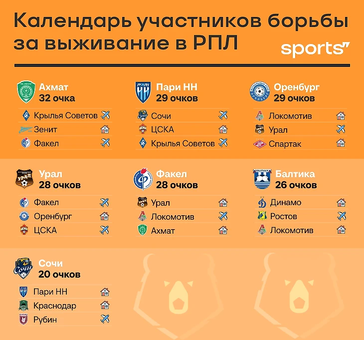 Кажется, самый тяжелый календарь у «Балтики». В последних трех матчах «Динамо», «Ростов» и «Локомотив»: поражение от «Урала» может прибить надежды на выживании в РПЛ. Чуть более легкое, но тоже непростое расписание – у почти вылетевшего «Сочи». После «Пари НН» ждут «Краснодар» и разыгравшийся «Рубин».