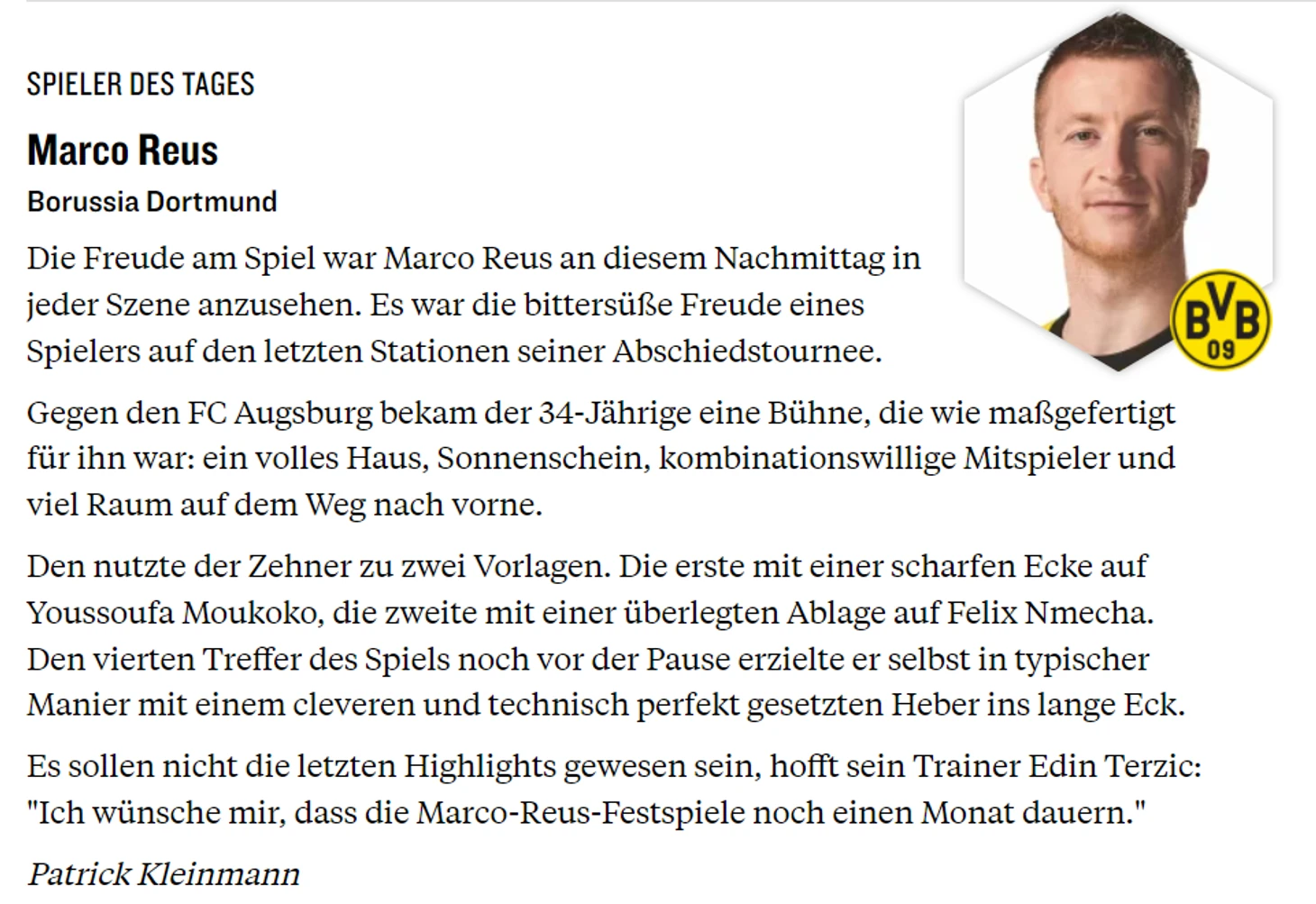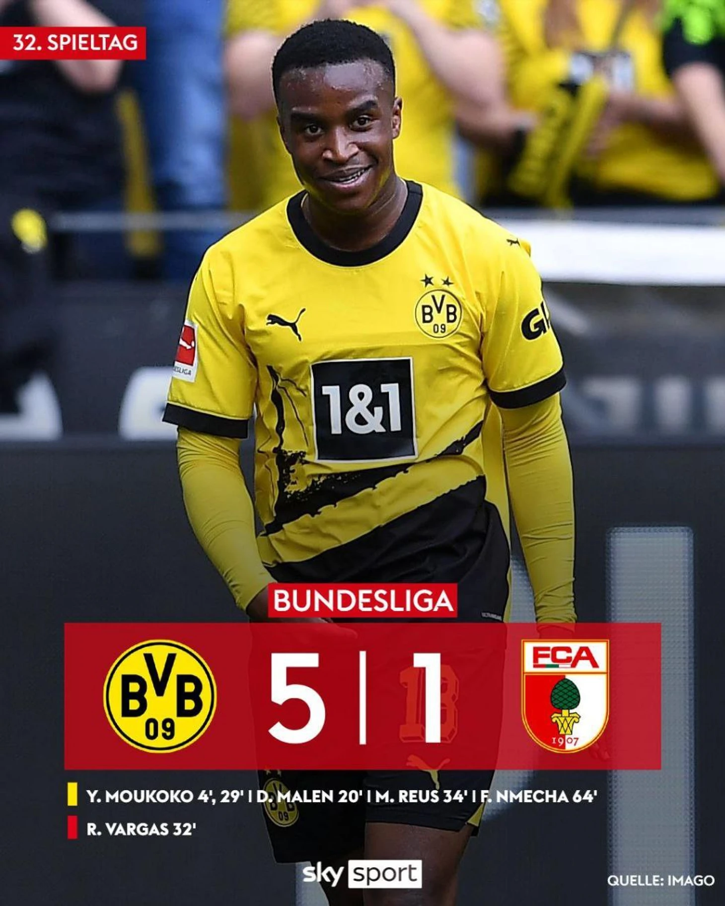 Подопечные Эдина Терзича провели ударную репетицию с повышенной ответственностью перед ответным матчем полуфинала Лиги чемпионов с ПСЖ, забивая мячи на любой вкус.Свой редкий шанс получили Пападопулос, Морей и Мукоко, дебютировал с первых минут юный Ветьен. Но главным героем в матче с «Аугсбургом» стал Марко Ройс, который проводил предпоследний матч за клуб на домашней арене. У Марко 1+2 за матч, дубль оформил Мукоко, а «фуггеры» получили в свои ворота целых пять мячей.