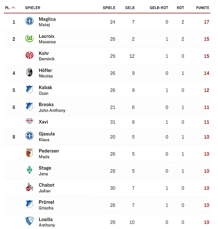 *игрок – кол-во игр – желтые – 1+1 желтые – красные – всего
