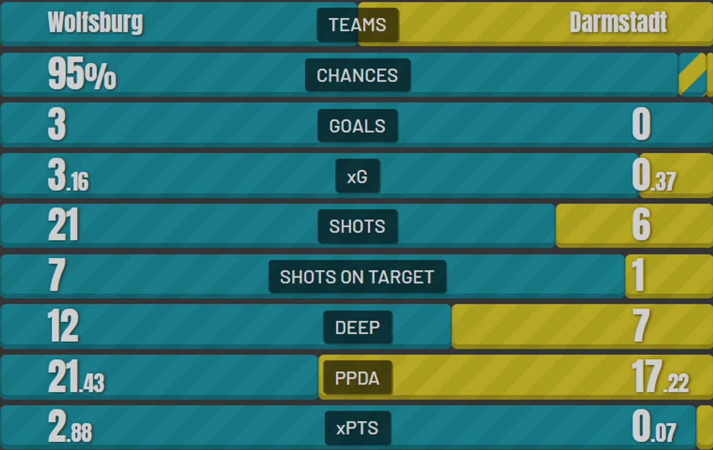 - «Вольфсбург» в этом сезоне заработал десять из 12 возможных возможных очков в противостояниях с «Хайденхаймом» (2:0 и 1:1) и «Дармштадтом» (1:0 и 3:0).