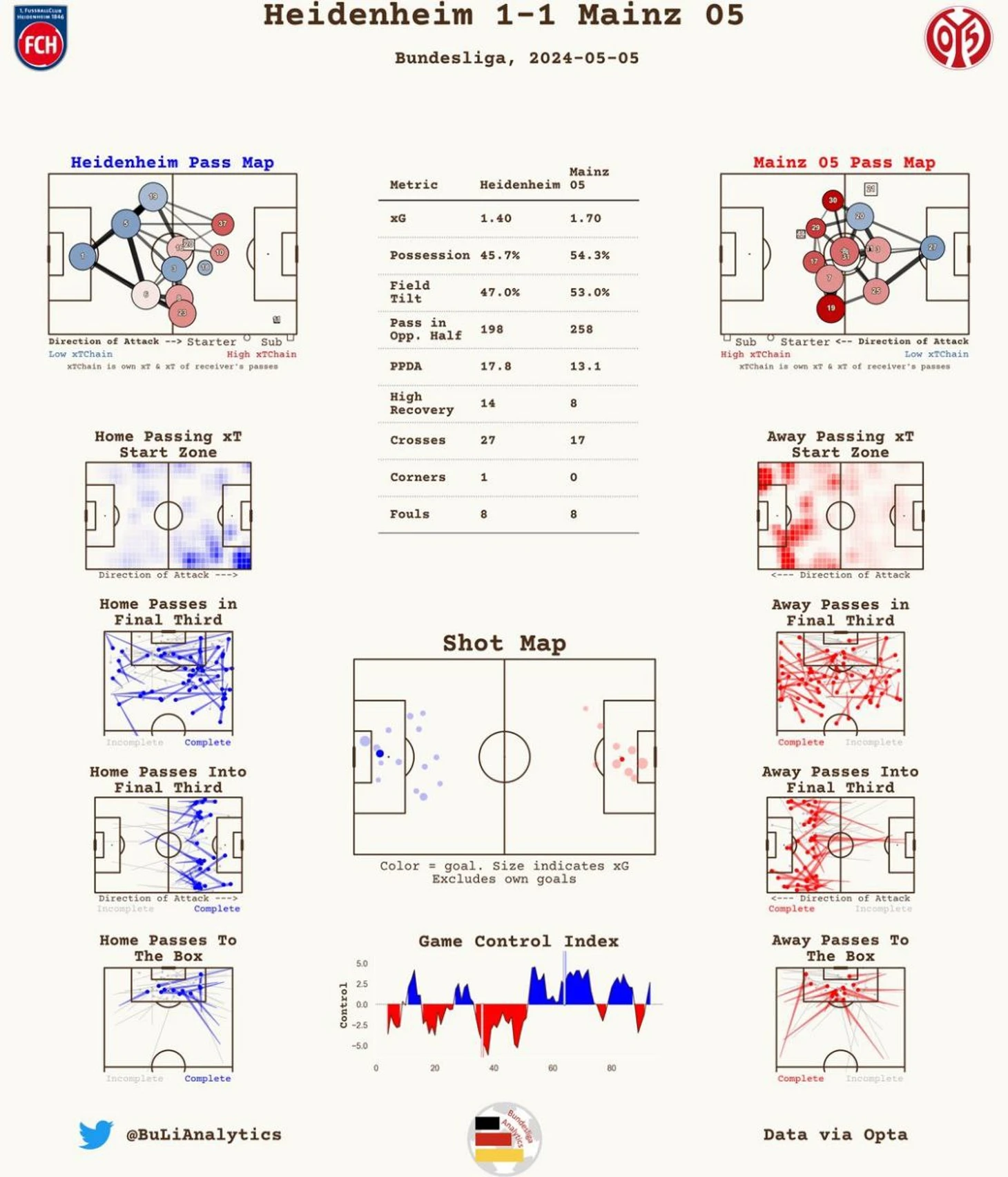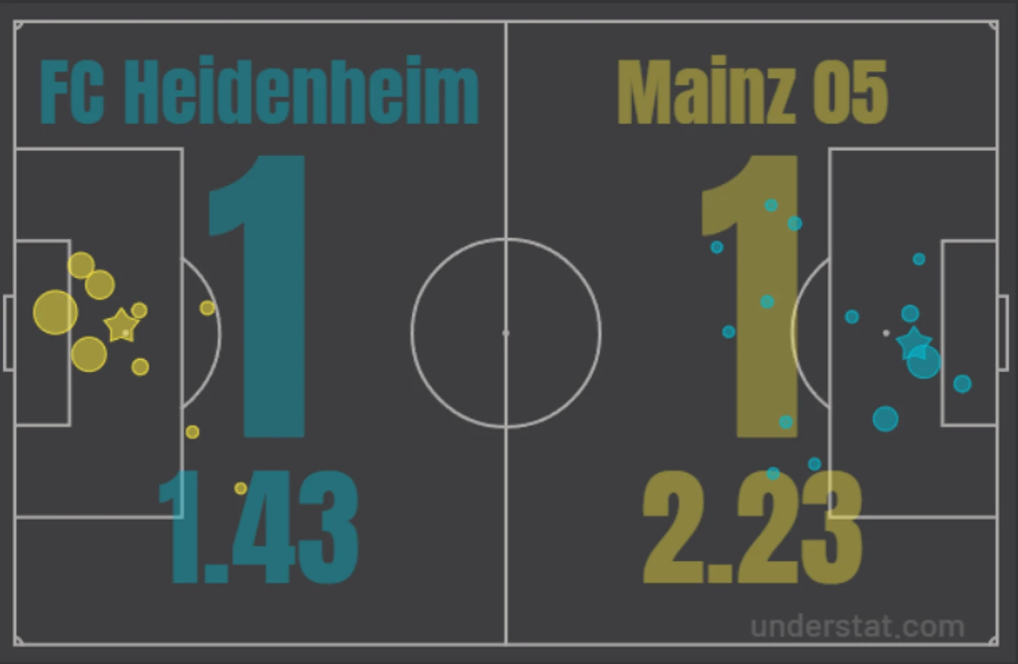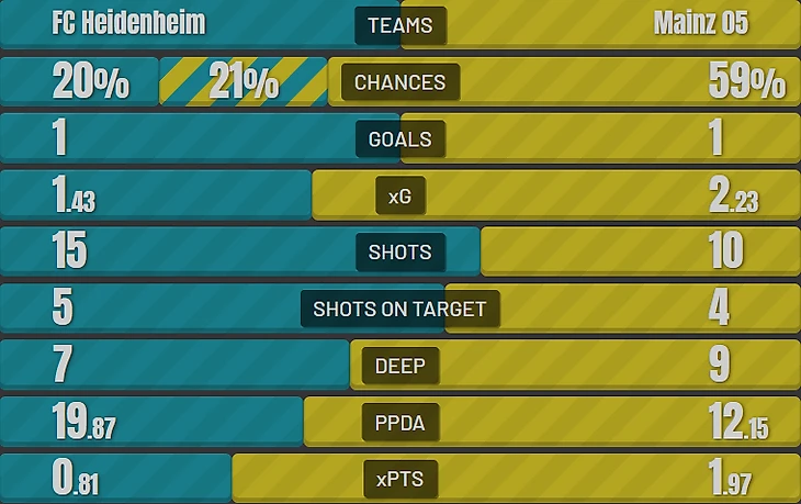 Первый опасный момент выдался в середине тайма. После навесной передачи от Траоре, Кляйндинст с нескольких метров пробивал по воротам Центнера, но Робин удачно сыграл на выходе. А «Майнц» затем смог открыть счет. После навеса с левого фланга от Каси в сторону одиннадцатиметровой, в одно касание пробил по воротам «Хайденхайма» Йонатан Буркардт.