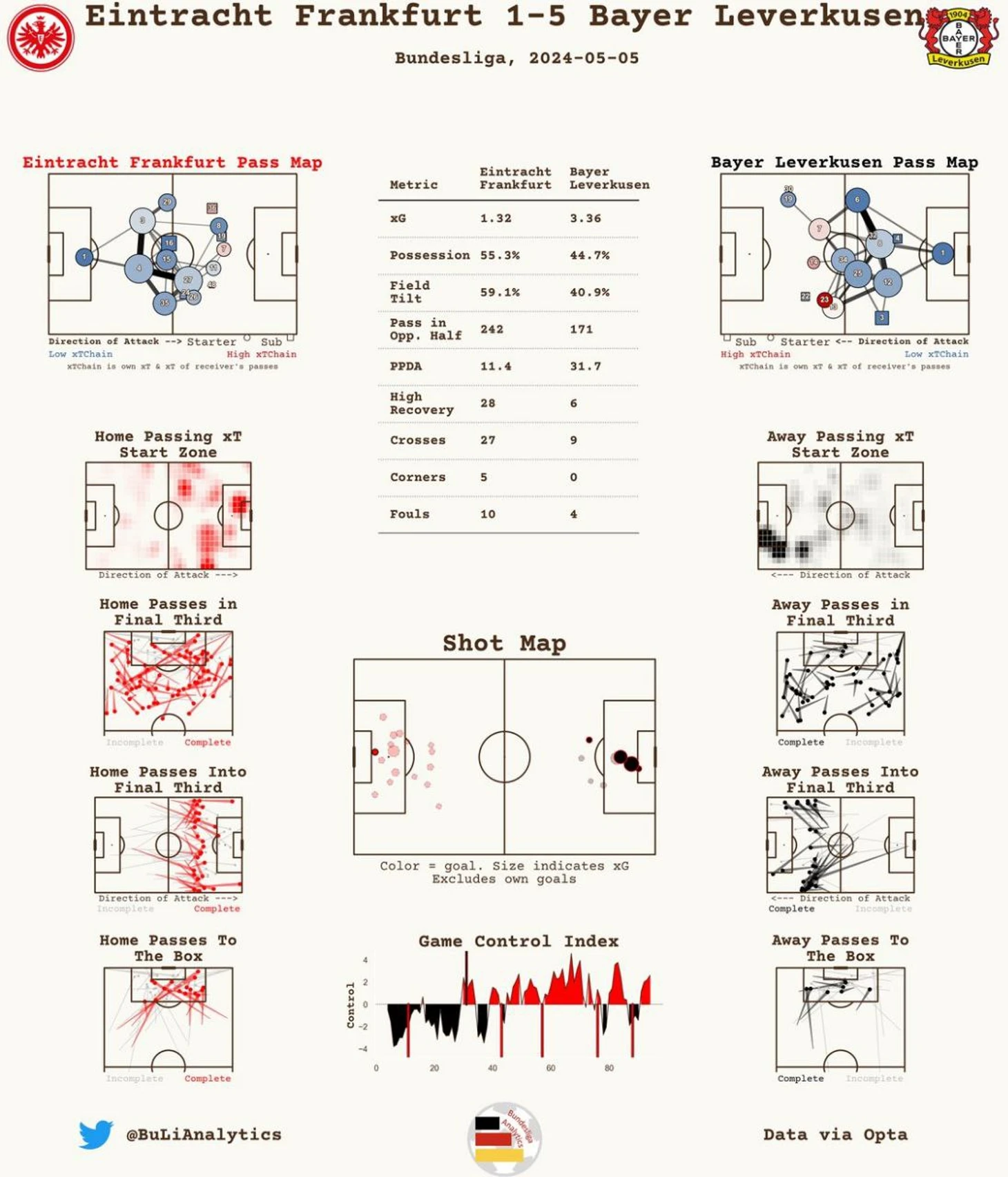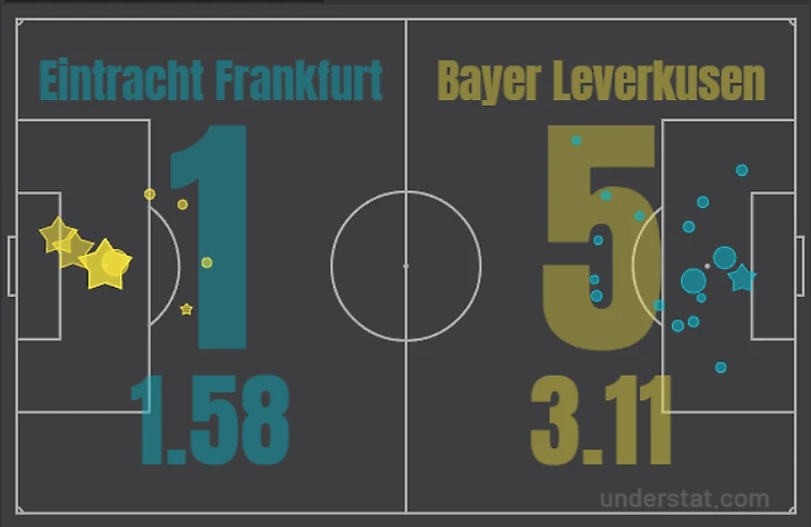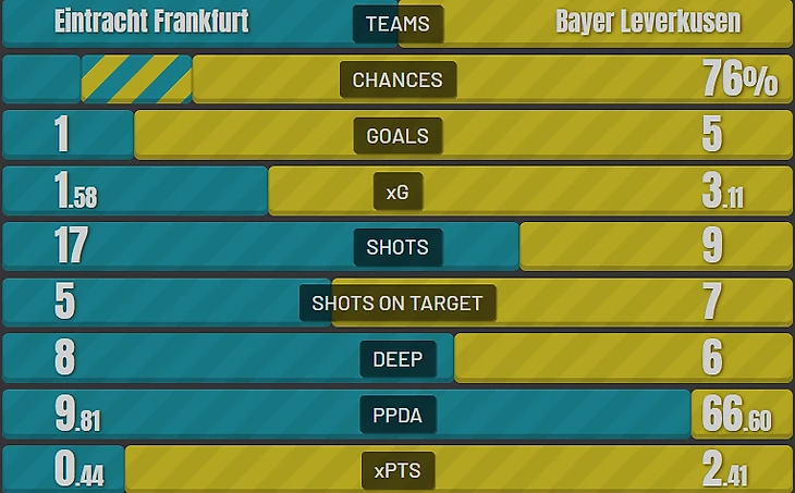 Хотя в первом тайме «Айнтрахт» ещё боролся. Хозяева неплохо вошли в игру, захватив инициативу в стартовые минуты. Но развить успех им не удалось. И уже очень скоро «Байер» начал терзать их гибридную схему, которая не успевала вовремя переходить с четвёрки на пятёрку в обороне. А также нащупывать слабости в билд-апе соперника.