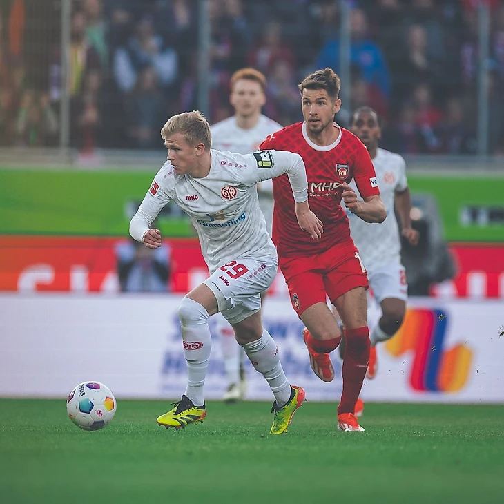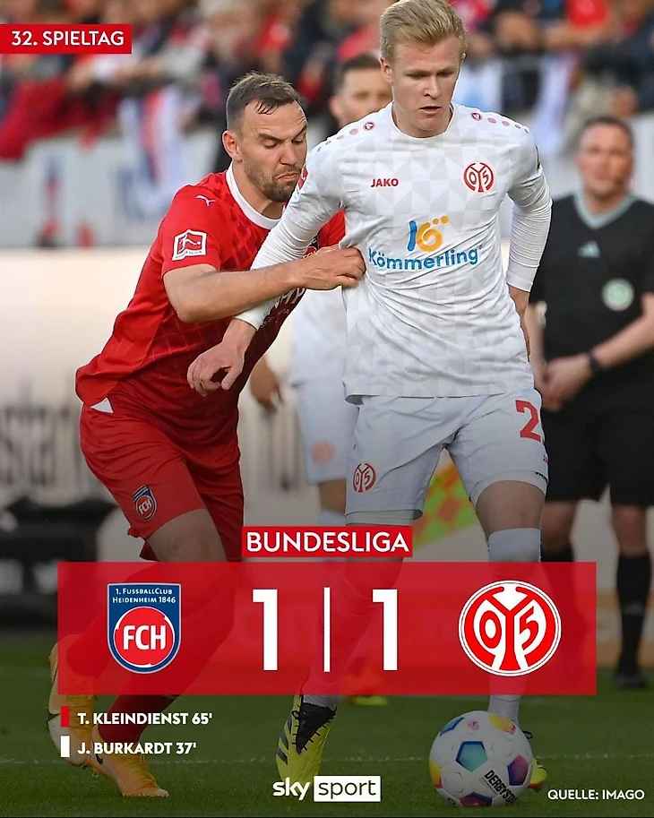 Второй тайм начался с опасного момента у ворот Мюллера: нападающий гостей Людовик Ажорк с близкого расстояния пробил мимо голкипера «Хайденхайма», но уже с линии отбил мяч ногой один из защитников хозяев. Далее уже Динкчи мог сравнивать счет во встрече. После передачи от Кляйндинста, Эрен выбегал один на один и пытался перебросить мяч через голкипера, но Центнер прочитал этот трюк от немца. Уже в середине тайма главный бомбардир хозяев сравнял счет во встрече. После навесной передачи от Траоре, Тим Кляйндинст сыграл головой на опережение в штрафной площадке гостей, где уже бессилен был Центнер. Затем капитан хозяев Патрик Маинка мог вывести свою команду вперед, но попал в штангу после навеса от Динкчи. Далее после появления на поле Нельсона Вайпера, игрок «Майнца» уже через считанные секунды мог сравнять счет, но голкипер «Хайденхайма» Кевин Мюллер удачно сыграл на выходе из ворот. Уже в добавленное арбитром время хозяева могли вырвать победу у гостей. После навеса Дениса Томаллы, Штефан Шиммер попал мячом в перекладину, чем мог похоронить надежды «Майнца» даже на ничью.