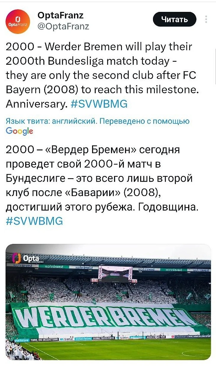 - «Вердер» провел свой 2000-й матч в Бундеслиге ― это всего лишь второй клуб после «Баварии» (2008 игр), достигший этого рубежа.