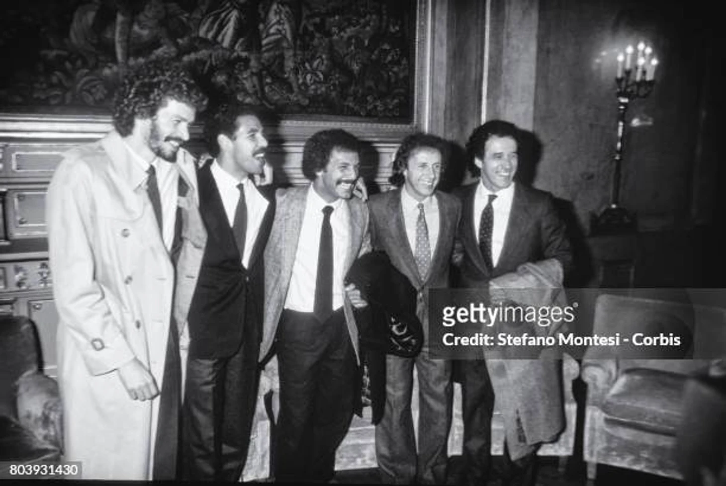27 января 1985, Рим. Сократес, Тониньо Серезо (Рома), Жуниор (Торино), Дирсеу (Асколи) и Батиста (Лацио) в ожидании встречи с Танкреду Невисом