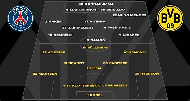 Главный тренер дортмундской «Боруссии» Эдин Терзич решил сыграть от обороны с 4-5 защитниками, в зависимости от ситуации и от количества подключавшихся в атаку французов: Грегор Кобель, Иан Маатсен, Нико Шлоттербек, Матс Хуммельс, Юлиан Рюэрсон, Эмре Джан, Марсель Забитцер, Карим Адейеми, Джейдон Санчо, Юлиан Брандт и Никлас Фюллькруг. В атаке же черно-желтые переходили на схему 4-1-2-2-1 (или 4-3-3).