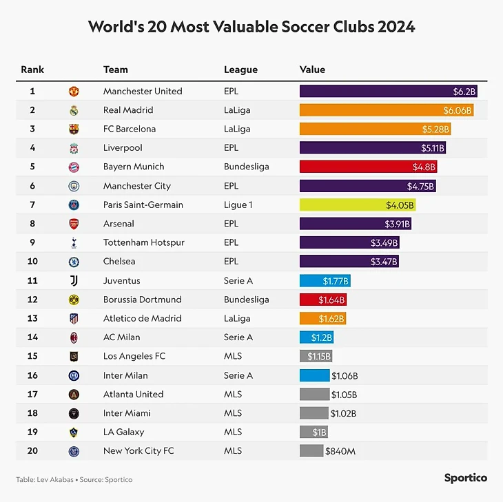 Эксперты по футбольным финансам Sportico обнародовали рейтинг самых дорогих футбольных клубов 2024-го года.