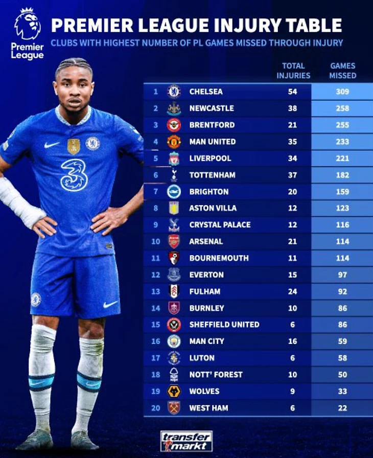 «Челси» – чемпион по травмам в этом сезоне: 54 игрока вылетали, 309 матчей суммарно пропущено. А кому везло больше?