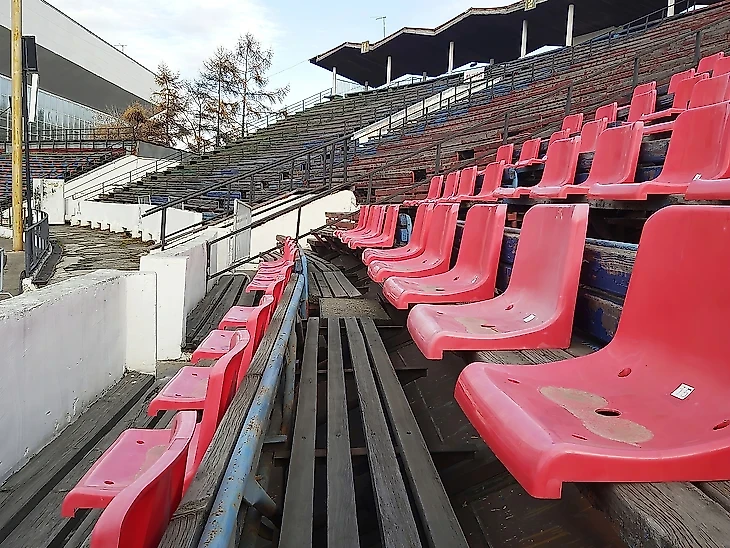 Внутри же стадион полностью соответствует дате своей постройки. Кажется, за почти 70-летнюю историю поменялся лишь облик трибун. Вместо деревянных скамеек появились пластиковые кресла, комбинация которых образует российский триколор. Выглядит, по правде говоря, не очень, но такова особенность большинства региональных стадионов. При этом большая часть трибун по-прежнему является наследием бурной советской молодости. Билеты на них не продаются.