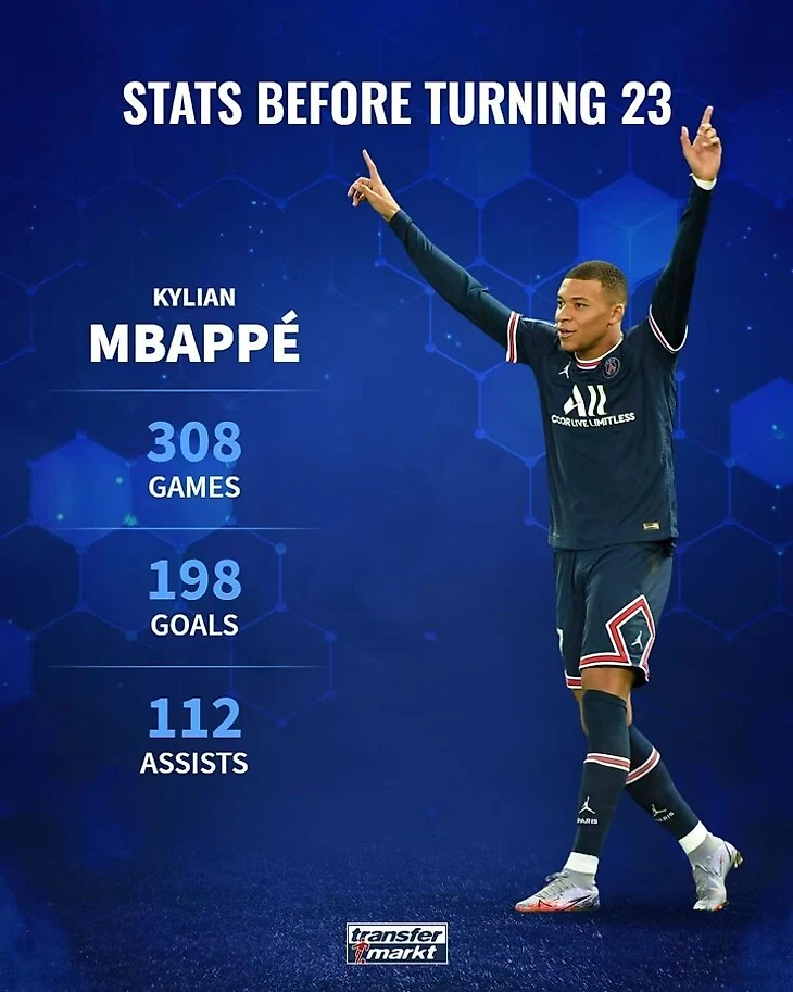 Мбаппе забил больше голов в «Лиге чемпионов» или «Кубке европейских чемпионов», чем такие легенды как: Эйсебио, Мо Салах, Дидье Дрогба, Неймар, Алессандро Дель Пьеро, Серхио Агуэро, Ференц Пушкаш, Герд Мюллер, Самюэль Это'о, Уэйн Руни, Давид Трезеге, Райан Гиггз, Луис Суарес и Ромарио.