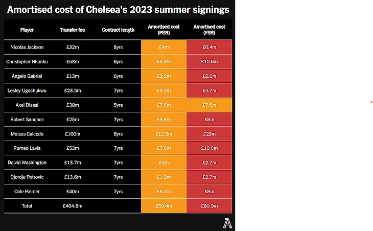 The Athletic подсчитал, что пятилетняя амортизация УЕФА увеличит ежегодную нагрузку на финансовые отчетности «Челси» от летних трансферов прошлого года с 59,4 млн до 80,9 млн фунтов в сравнении с PSR. Этот расчет основан на том, что летом 2023 года «Челси» потратил 404,8 млн фунтов, судя по трансферным обязательствам клуба. Однако позднее «Челси» в финансовых отчетностях признался, что после 30 июня 2023 года было потрачено 454 млн фунтов на трансферы, что намекает на то, что на 11 игроков, которые переехали на «Бридж» в то окно, потратили даже больше, чем указано в отчетах. А это в свою очередь увеличивает нагрузку на амортизацию.