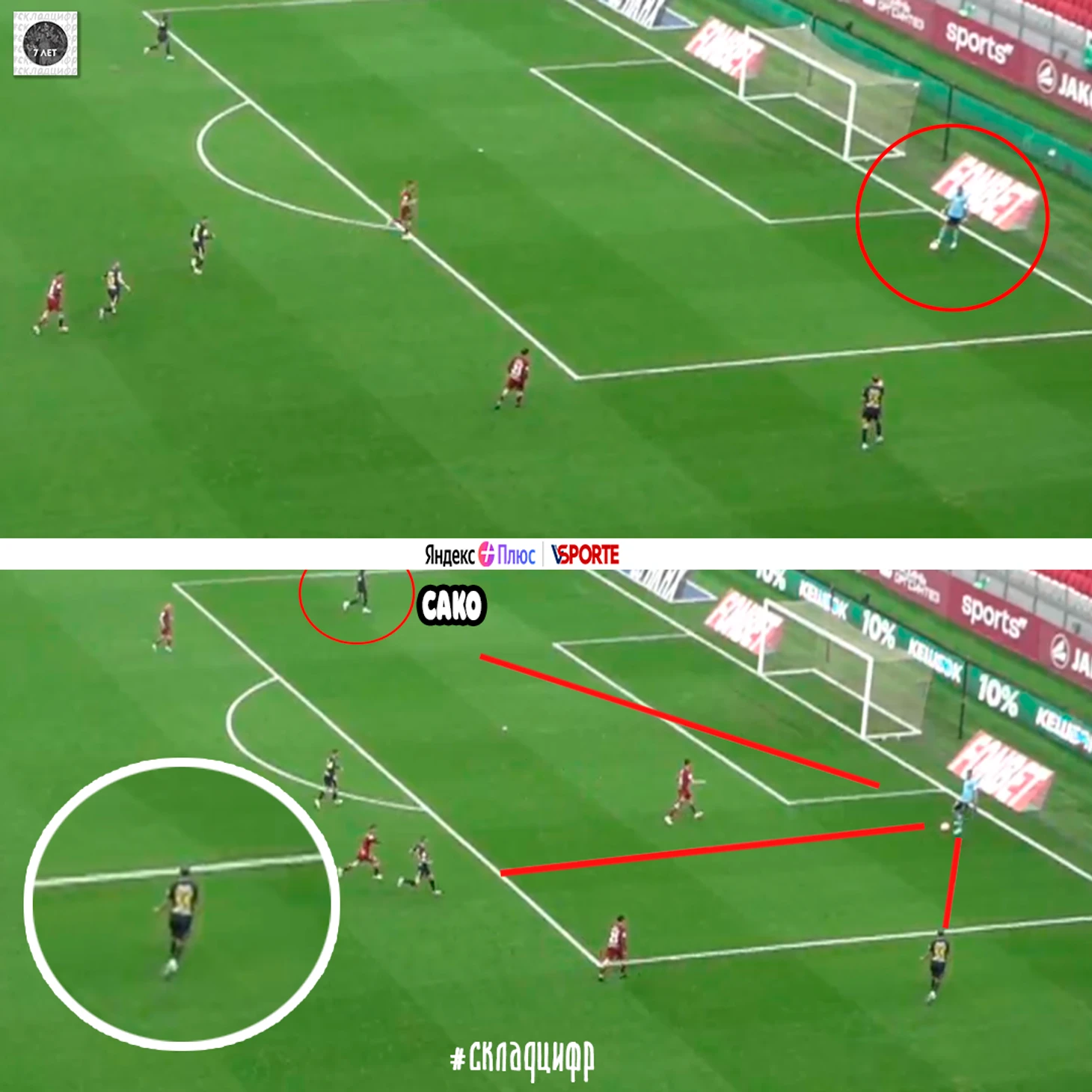 Как и в первом эпизоде, мяч Никите никто не сует в пожарную ситуацию, он принимает его в гордом одиночестве, а ближайший игрок соперника в десятке метров от вратаря. Снова хочу обратить ваше внимание на тайминги: 23:55 - уже ясно, что Осипенко будет отдавать на вратаря, 23:57 - мяч идет в сторону вратаря, 23:59 - мяч в ногах Медведева. Снова видим, что у голкипера три адресата для передачи, а если обратить внимание на Осипенко, то он всем своим видом показывал: «МЕДВЕДЬ, ВЕРНИ МНЕ МЯЧ». Но Никита бездумно отправляет мяч в центр поля, причём действительно бездумно - мяч уходит туда в 24:00. У вратаря было ПЯТЬ СЕКУНД в полной безопасности, чтобы оценить ситуацию на поле, увидеть возможные ходы и прочитать игру наперёд. Да что там их читать? У тебя игрок в метре просит вернуть мяч. Я уже не говорю, что можно было развернуть корпус и отдать в зону Сако. К сожалению, Никита попросту не понимает, что делать в таких ситуациях. Отмечу еще раз, что ему не пихают мяч в пожарные ситуации, из которых ловко выходил Песьяков раз за разом, он получал мяч в полной безопасности и с временным гандикапом. Вот только голова почему-то у вратаря в такие эпизоды отключается.