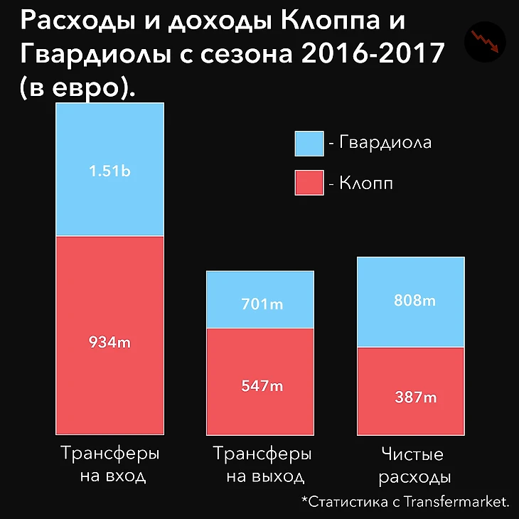 Клопп тратил куда меньше Гвардиолы, притом, что пришел в кризисный «Ливерпуль», когда как Гвардиола имел относительно неплохой «Сити».