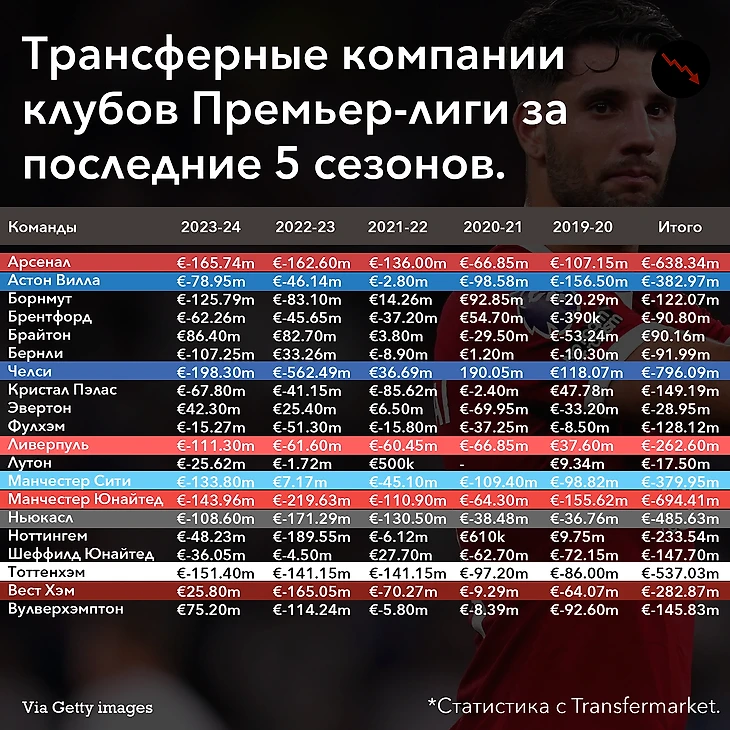 Последние трансферные окна «Ливерпуля»: 3 из 5 сезонов клуб уходил в минус 60 млн, когда как конкуренты имели несколько сезонов из 100 млн. У Клоппа в этом отношении все стабильно: 2023-24 - единственный сезон, выходящий за рамки, но в сезоне 2019-20 команда имела хорошую выручку.