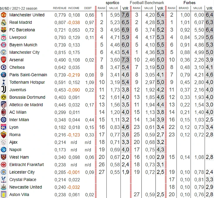 Под руку попались аналогичные рейтинги Football Benchmark (THE EUROPEAN ELITE 2023) и Forbes (WORLD’S MOST VALUABLE SOCCER TEAMS). На самом деле, какой рейтинг стоимости может обойтись без Forbes?! Но, есть нюанс, оба исследования базируются на данных за сезон (финансовый год) 2021/22. Поэтому пришлось сходить в анналы истории публикаций sportico и достать оттуда прошлогодний релиз их рейтинга. Соблюдаем чистоту эксперимента.