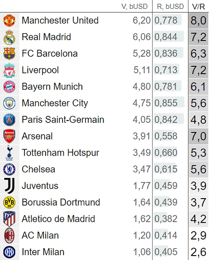 С выручкой разобрались, благо данные о ее значении, принятом в расчете, sportico публикует. Теперь самое интересное – мультипликатор. Разберем ТОП15 клубов Европы по стоимости.