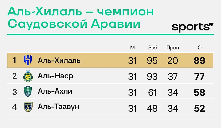 🥇 «Аль-Хилаль» не проиграл ни одного матча лиги: лишь две ничьих за весь сезон и аж 29 побед! Из них 16 сухих.
