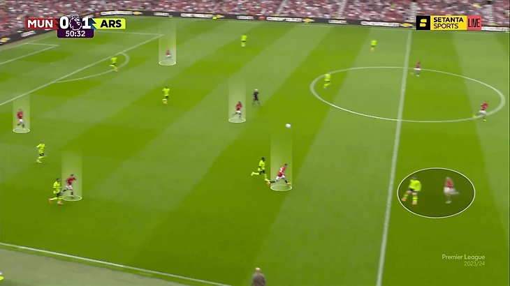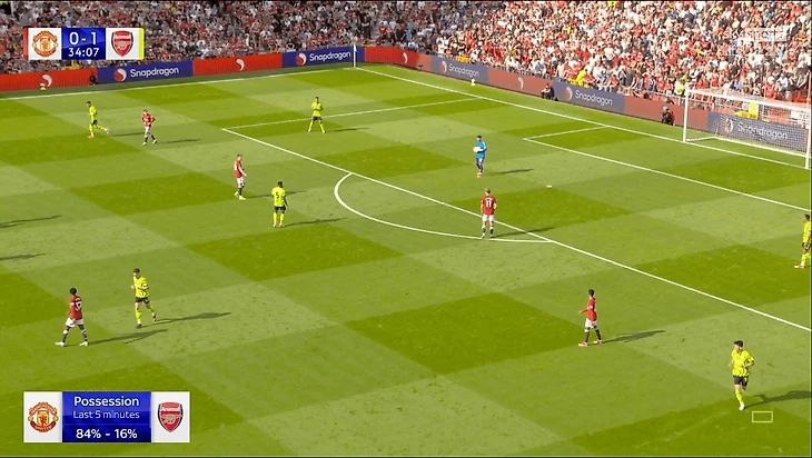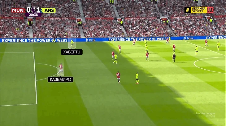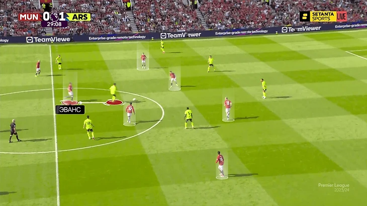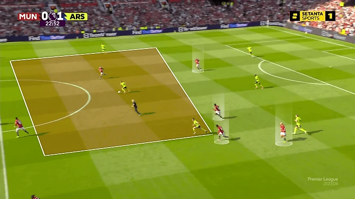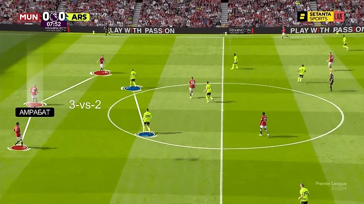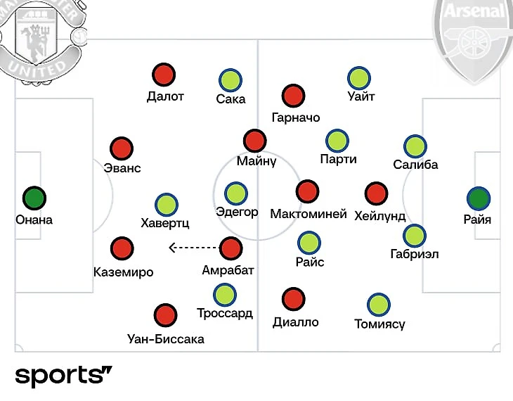 Постоянные опускания Амрабата создавали численный перевес против пары Хавертц/Эдегор, которые у «Арсенала» начинают давление. Кто-то из тройки «МЮ» получал свободу и продвигал мяч. Не беда для гостей – могли опуститься на свою половину и встречать соперника в среднем/низком блоке. Но на владении точно отразилось.