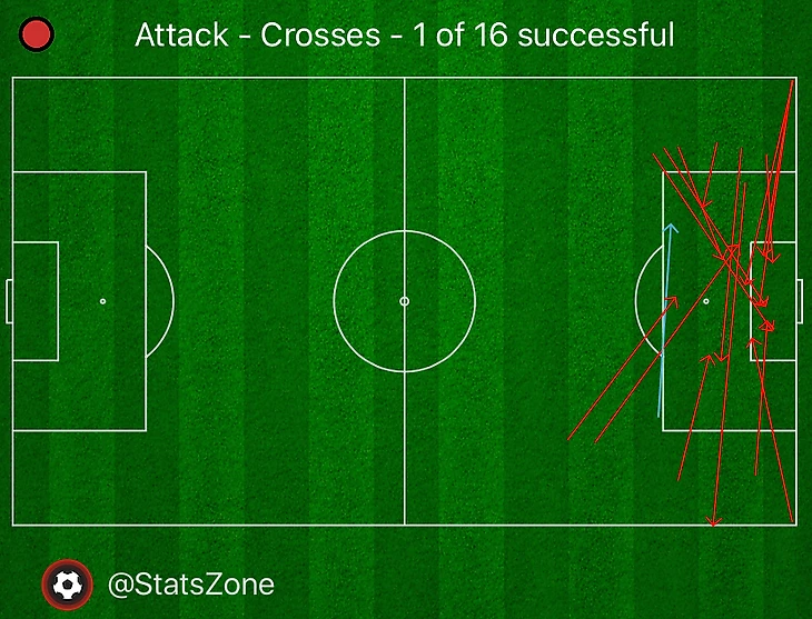 Вот характерная карта кроссов хозяев. За весь матч 16 попыток. До адресата дошла всего одна: