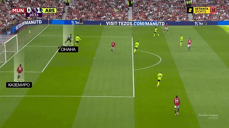Забавно, что единственный мяч пришел из-за розыгрыша «МЮ» и привоза. Проявилась несогласованность – беда команды по сезону. Каземиро хотел разыграть коротко, Онана из-за отсутствия других вариантов дал длину: