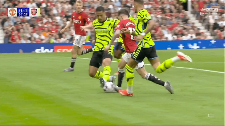 Недостаток идей проявлялся, когда Гарначо простреливал в штрафную, а не бил сам. Не только его вина, что мячи не доходили до партнеров: по ходу матча Гари Невилл заметил, что Хейлунд и Мактоминей открываются в одной точке. Похвалить стоит и гостей: Райя как обычно здорово выходил из ворот, а Габриэлу и Салиба помогали справляться с верховыми мячами опорники (в этот раз их было два).
