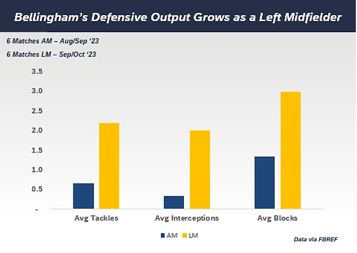 Мадрид начал сезон с ромбом в центре поля. Причем Джуд играл 10-ку в полном понимании этого слова. Он не особо отрабатывал в обороне. Сливочные начали сезон в Бильбао и там Джуд пахал за всех. Понятно, что и соперник достаточно грозный, и это его дебют. Затем, в следующих 5 матчах он совершил только 1 отбор и 0 перехватов. То есть в обороне он был несколько пассивен, что свойственно десяткам.