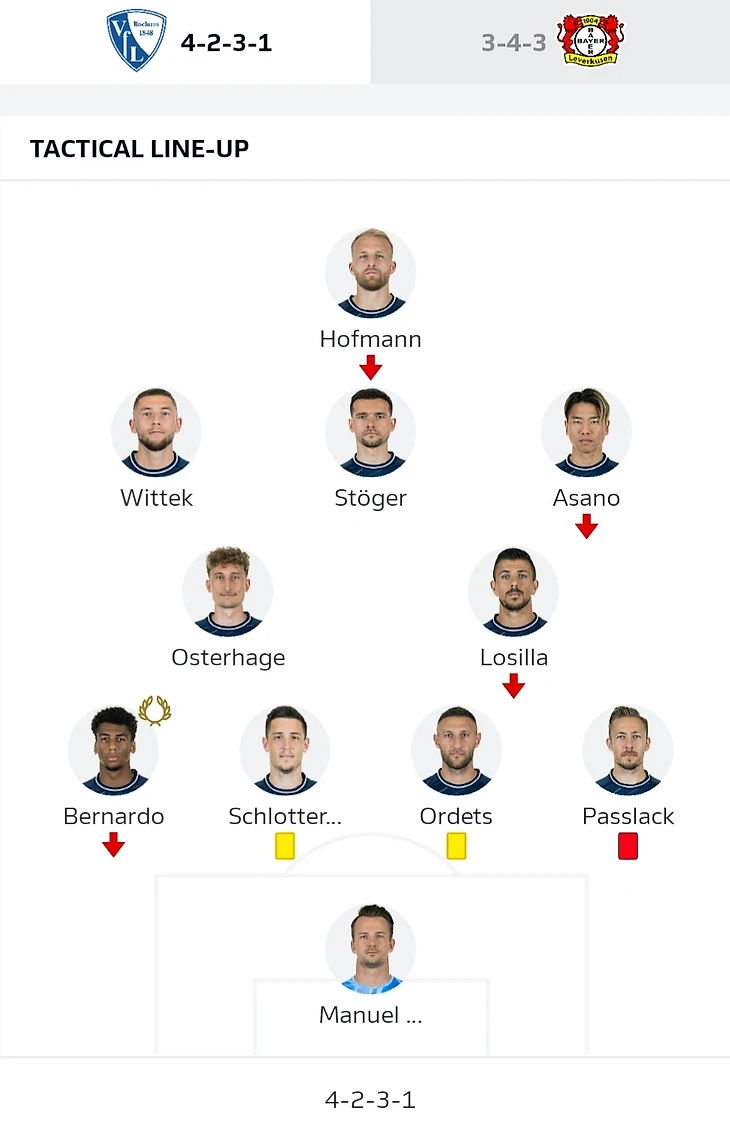 Хайко Бутшер выставил стартовый состав по схеме 4-2-3-1, которая использовалась и в предыдущем матче против «Униона Берлина». Главный тренер «Бохума» внёс два изменения по сравнению с прошлой игрой: (в полузащите вместо Беро вышел Лосилья, а правым вингером стал Асано вместо Брошински). Вратарь: Риманн, защита: Бернарду, Шлоттербек, Ордец, Пасслак, полузащита: Остерхаге и Лосилья. Нападение состояло из Виттека (левый вингер), Штёгера (атакующий полузащитник), Асано и Хофмана на острие атаки.