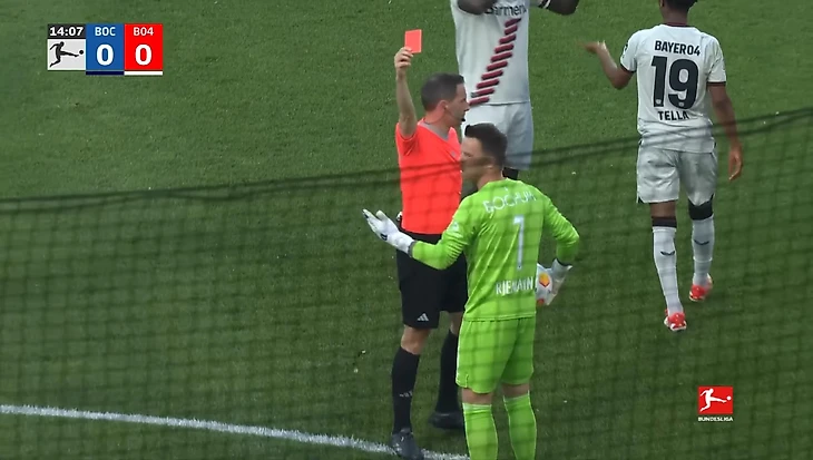 «Бохум» резво начал первый тайм, но красная карточка Пасслака на 13-й минуте выбила команду Бутшера из привычного ритма. Тапсоба отлично увидел забегание партнёра по команде и забросил на него мяч. Пасслак, догоняя, откровенно придержал Теллу за футболку и отправился отдыхать за пределы поля.