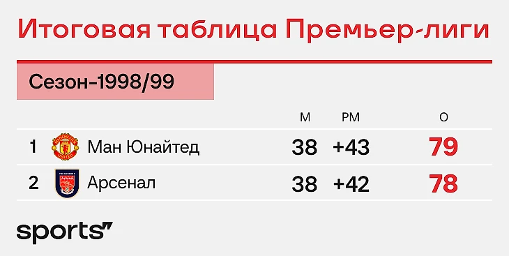 В сезоне-1998/99 «Манчестер Юнайтед» выиграл требл: в тройке трофеев, конечно, был чемпионат Англии. Спор с «Арсеналом» шел до последнего тура.