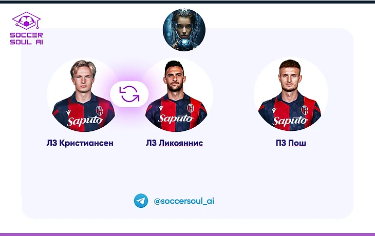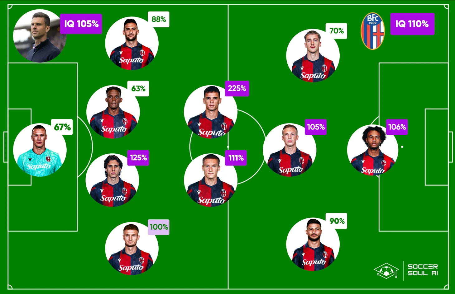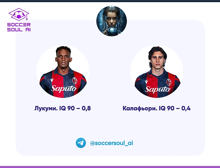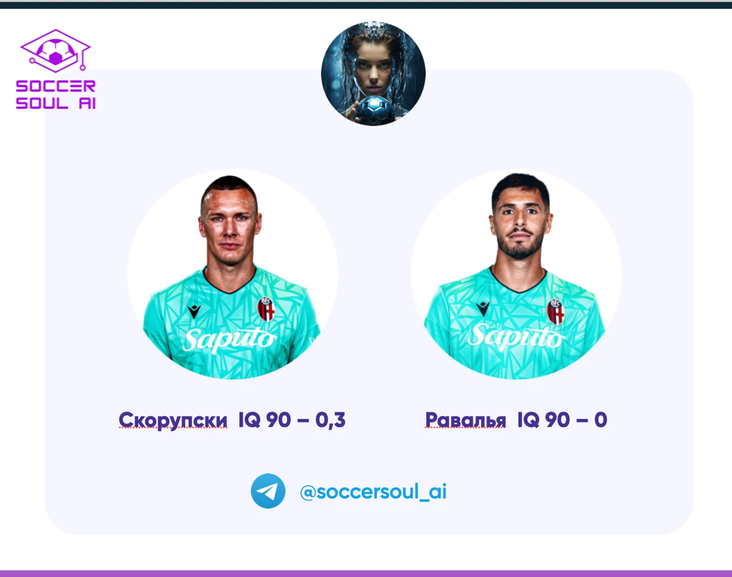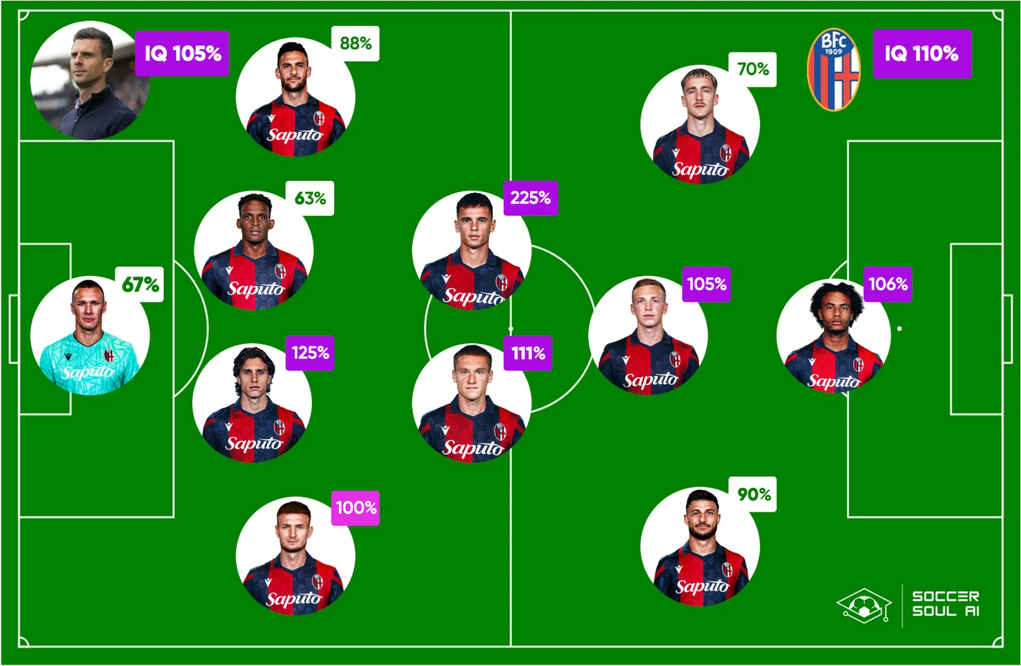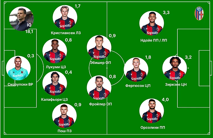 Резюмируя, обновим оптимальный состав Болоньи по показателям на 19-й тур, по метрике IQ за 90 минут игры для каждого футболиста: