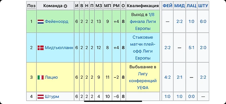 А если говорить про самое-самое равенство очков в еврокубках, то тут особняком стоит пример, также, группы F, только в Лиге Европы 2022/2023: аж четыре коллектива набрали одинаковое количество очков: