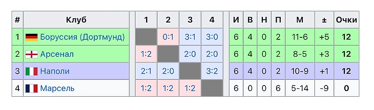 В последнем туре лондонцам достаточно было не проиграть в Неаполе с разницей больше, чем в 2 мяча - тем самым гарантировать преимущество над «Наполи» в плане разницы мячей при возможном равенстве очков у трех команд, а «Боруссии» просто нужна была выездная победа в Марселе. И далее, если три коллектива набирают по 12 очков, считается разница мячей в матчах между этими соперниками (так сказать, золотая разница) и перед последними играми у «Боруссии» она была «+1», у «Арсенала» «+2», у «Наполи» «-3».