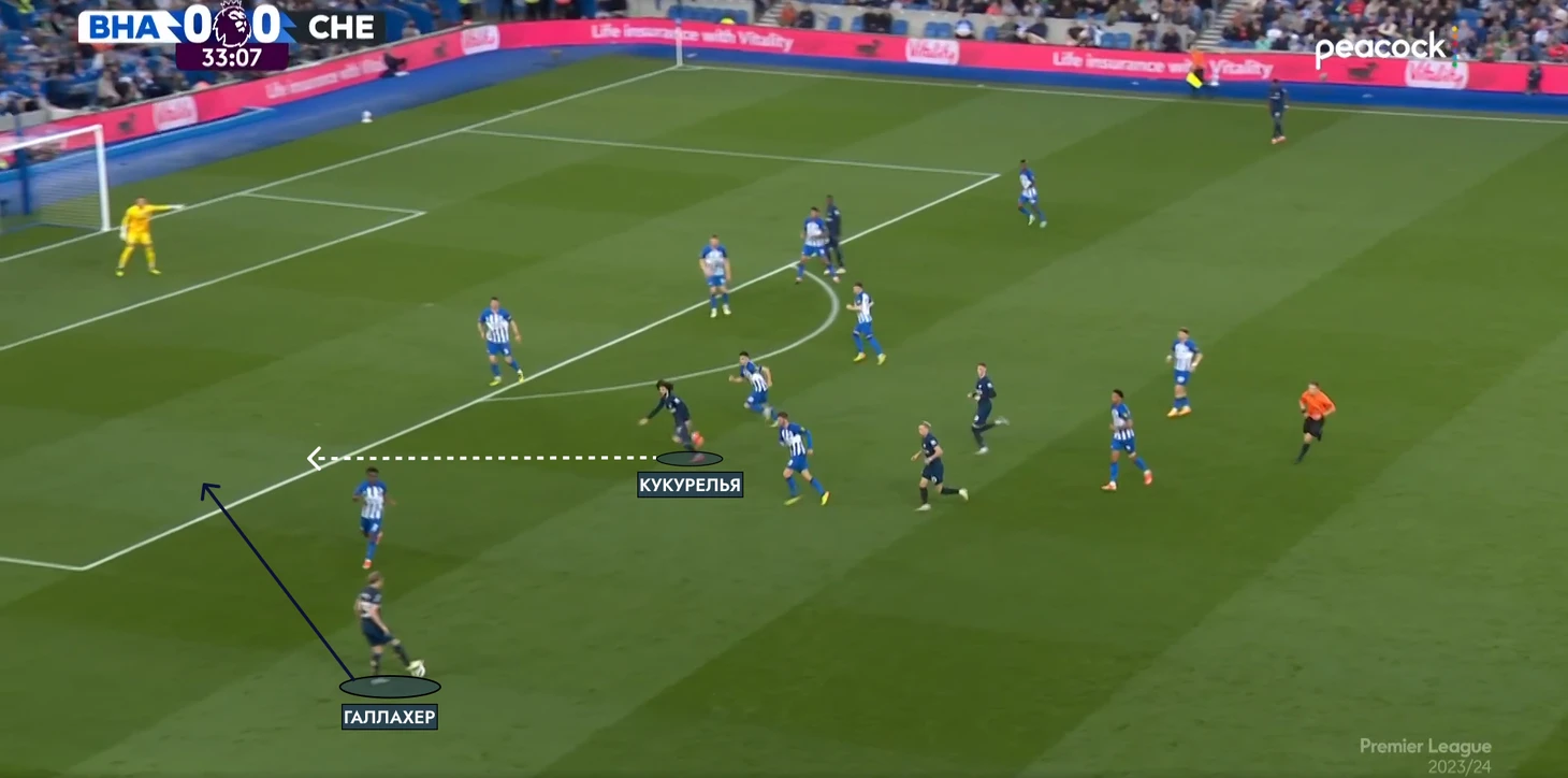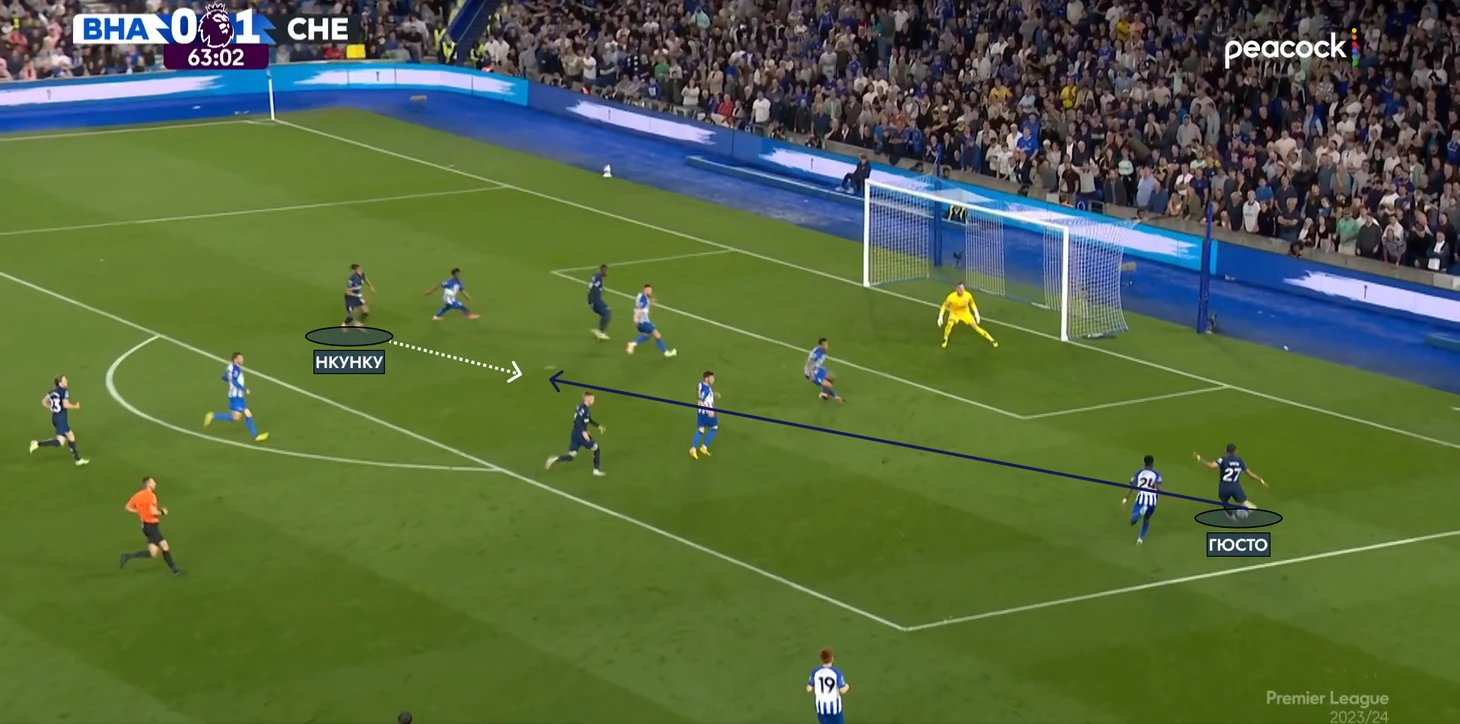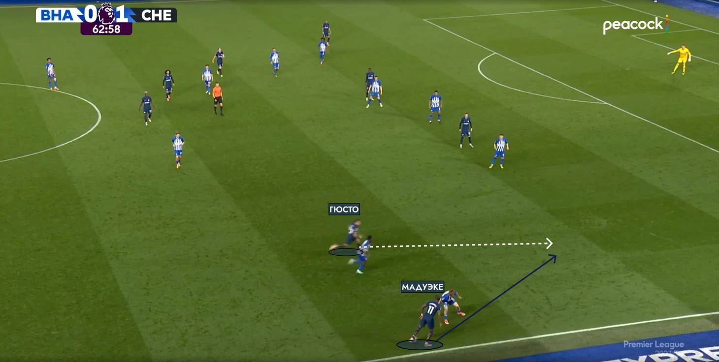 В одном из таких «перемещений», Гюсто продвинет атаку передачей на Джексона, но Николас, обыгрывая вратаря, слишком далеко отпустит мяч. Такое «чередование» подключений предполагало идею запутать игроков «Брайтона», и открыть свободное пространство для продвижения атаки.