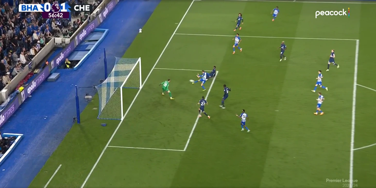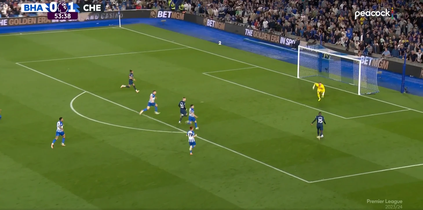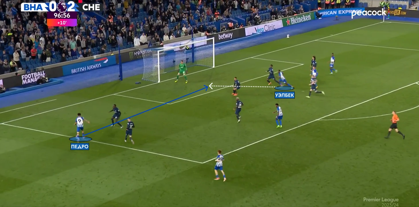 В одном из таких «перемещений», Гюсто продвинет атаку передачей на Джексона, но Николас, обыгрывая вратаря, слишком далеко отпустит мяч. Такое «чередование» подключений предполагало идею запутать игроков «Брайтона», и открыть свободное пространство для продвижения атаки.