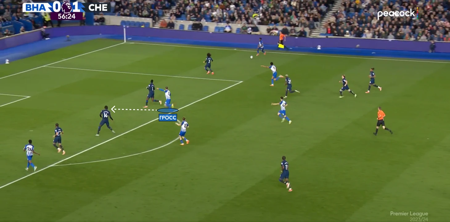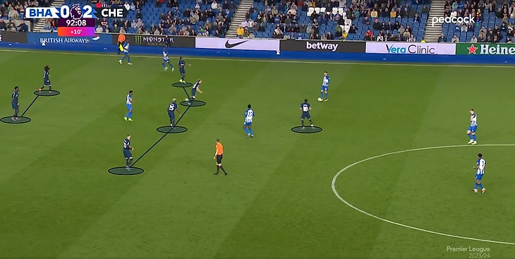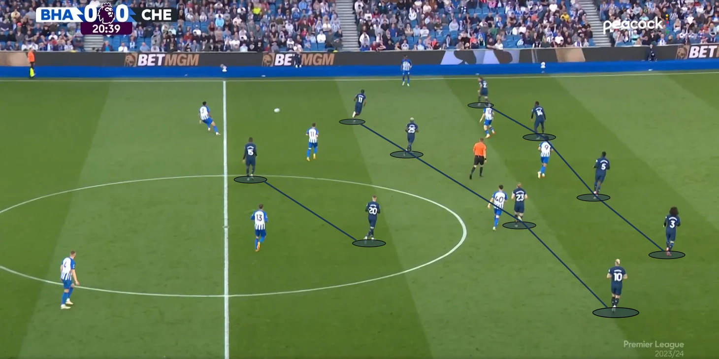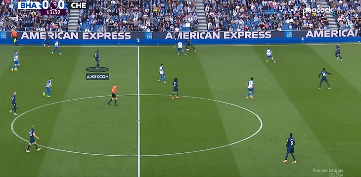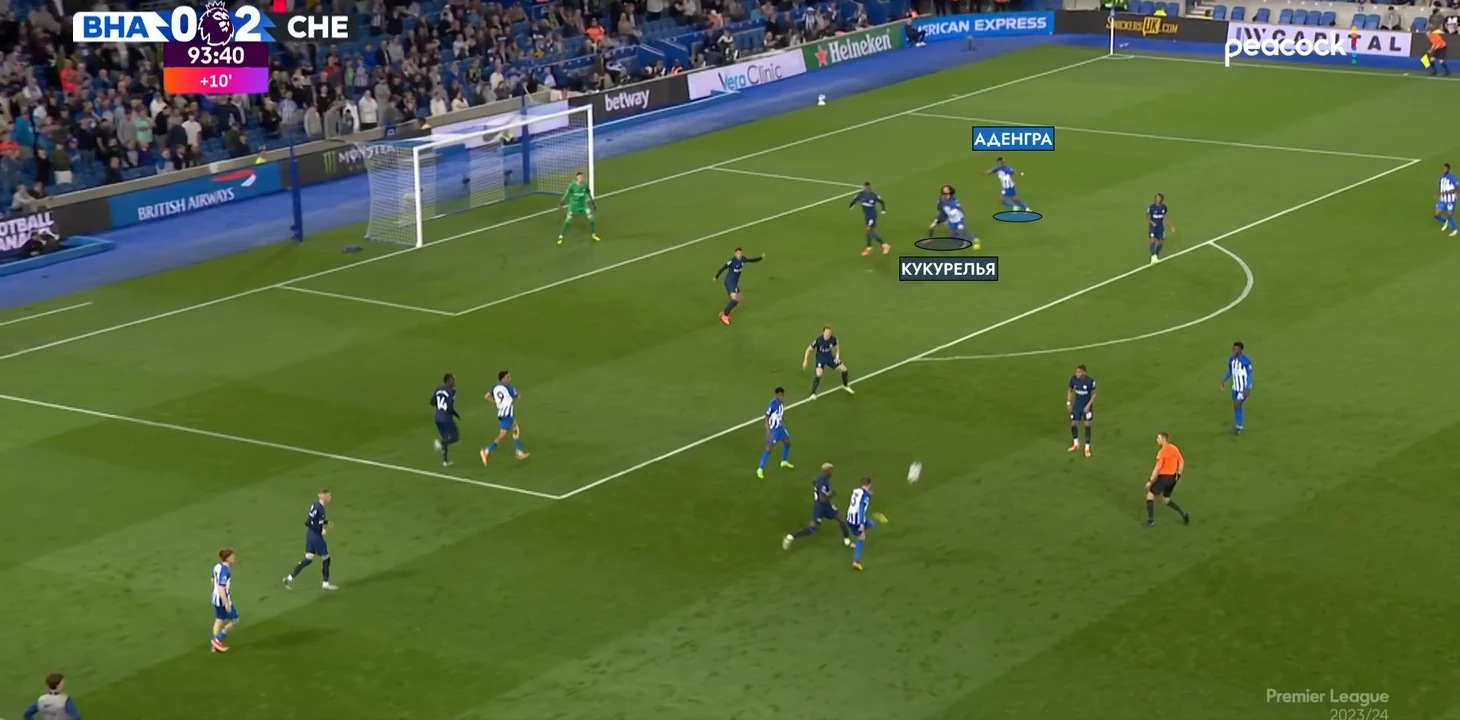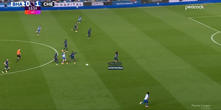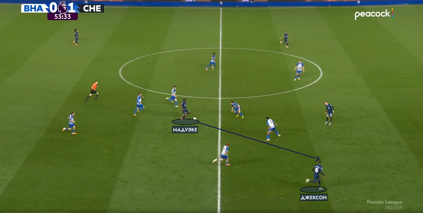 «Синие» выходили из-под прессинга и с помощью индивидуальных действий. Возьмем в пример выход «Челси» 3 в 0. После атаки «Брайтона» мяч подбирает (и в тяжёлой позиции сохраняет) Николас Джексон, успевая отдать пас на Мадуэке. Нони смог пробежать с мячом до центрального круга и отдать пас на Нико, за которым не успел Барко.