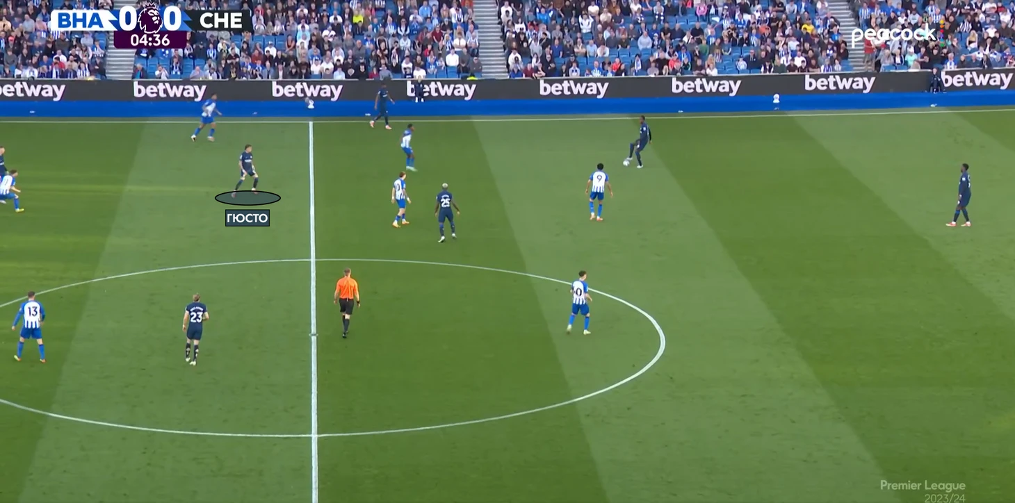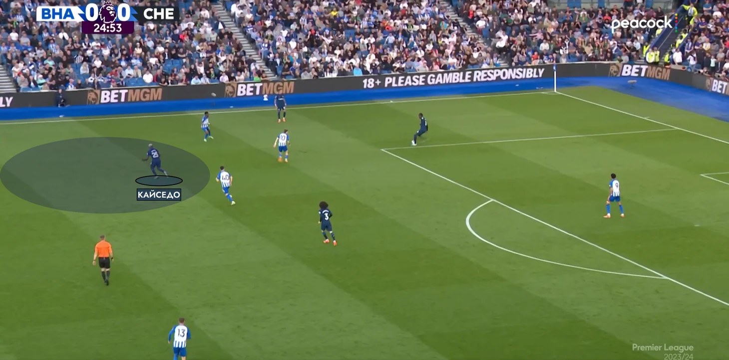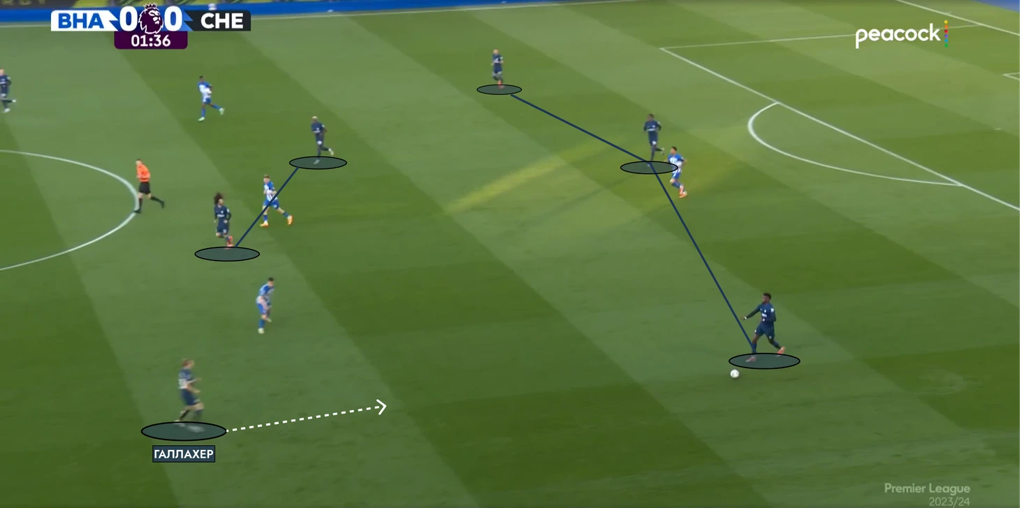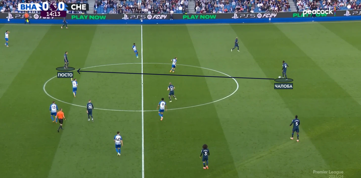 «Челси» начинал позиционные атаки уже в привычной схеме с тремя центральными защитниками. По классике, Марк Кукурелья в атакующей фазе поднимался в зону Кайседо. В этом плане было интересно посмотреть, какую роль возьмет на себя Гюсто – француз привычно будет больше сконцентрирован на атаку, или в этой встрече выступит с функционалом Трево Чалоба – максимум движений лишь до центрального круга?