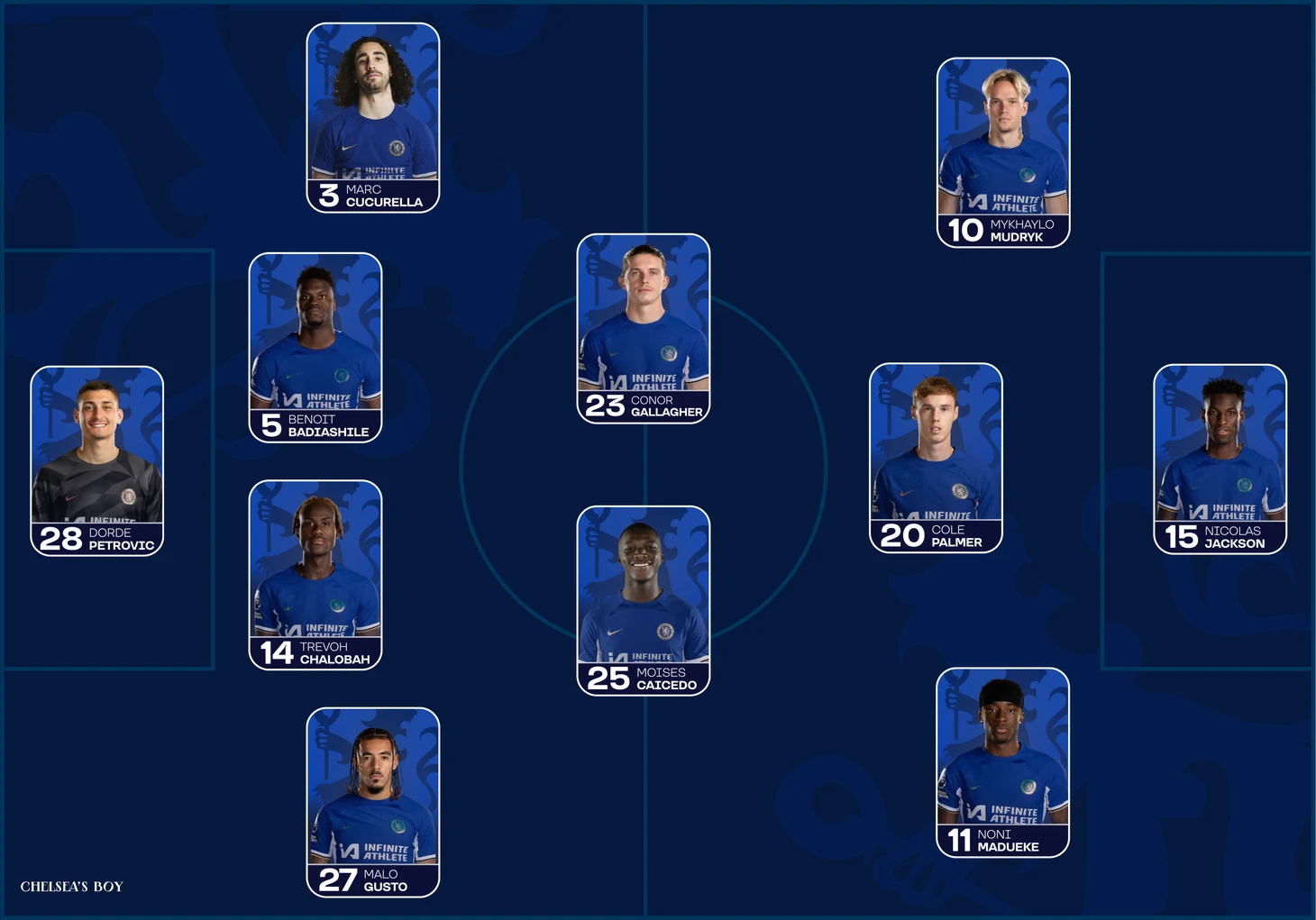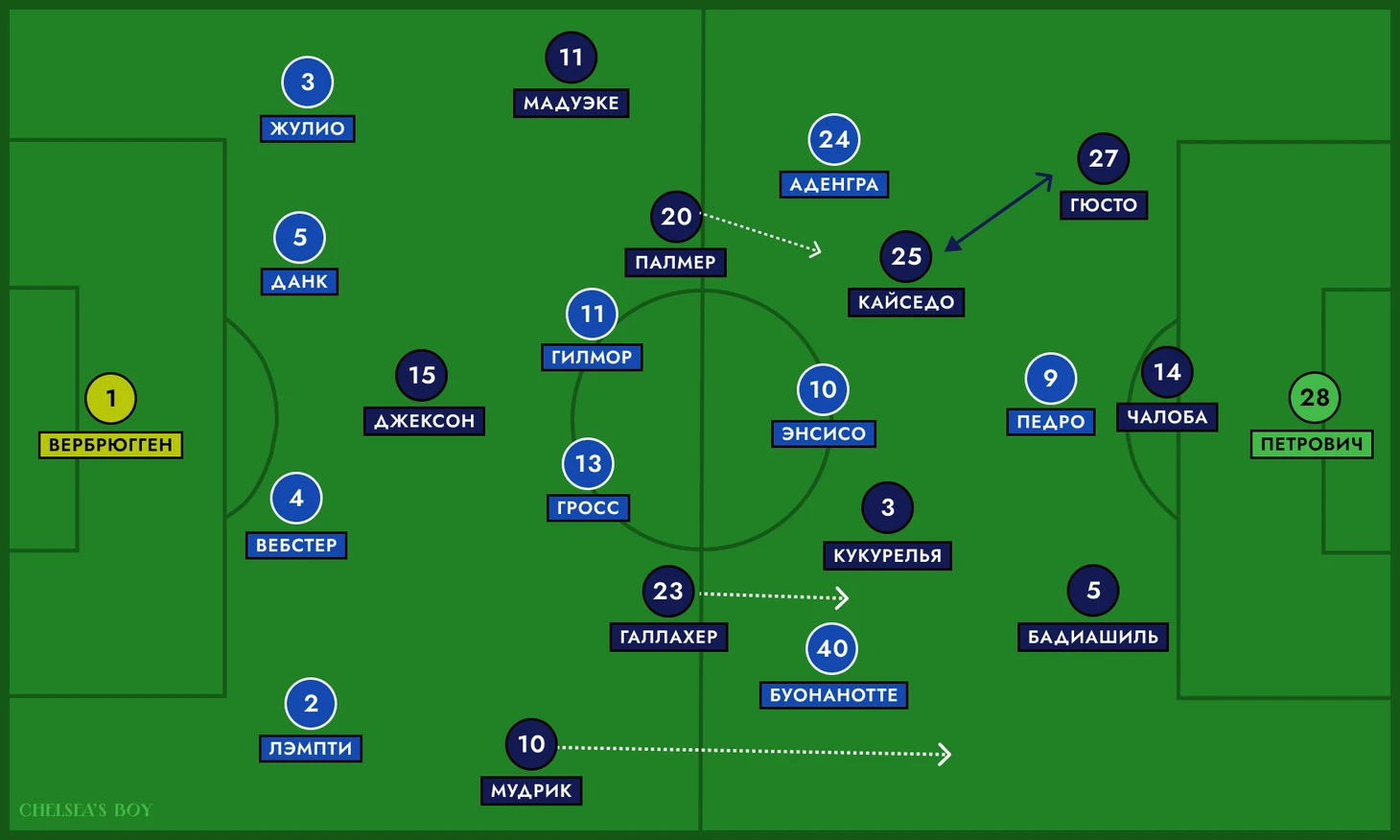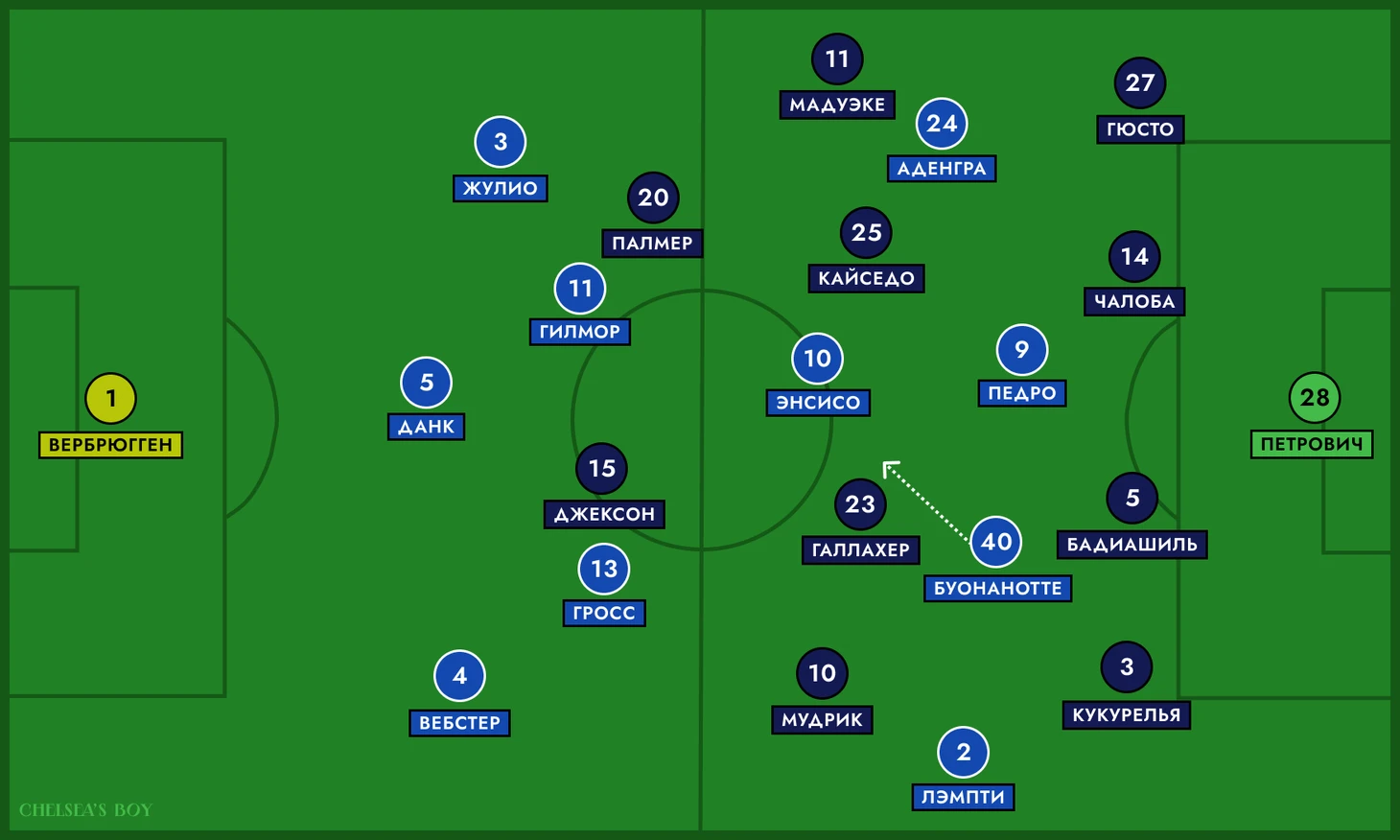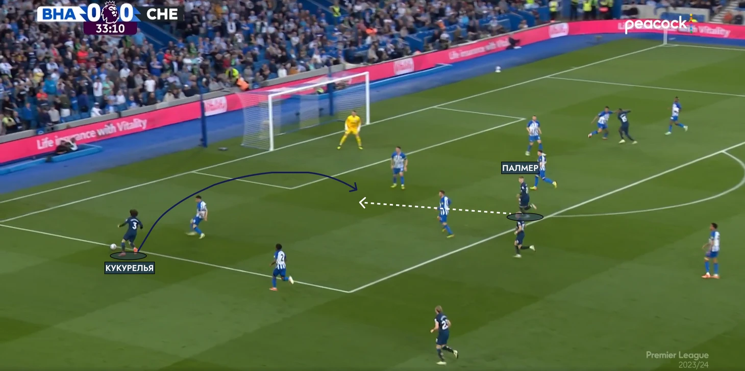 «Челси» начинал позиционные атаки уже в привычной схеме с тремя центральными защитниками. По классике, Марк Кукурелья в атакующей фазе поднимался в зону Кайседо. В этом плане было интересно посмотреть, какую роль возьмет на себя Гюсто – француз привычно будет больше сконцентрирован на атаку, или в этой встрече выступит с функционалом Трево Чалоба – максимум движений лишь до центрального круга?
