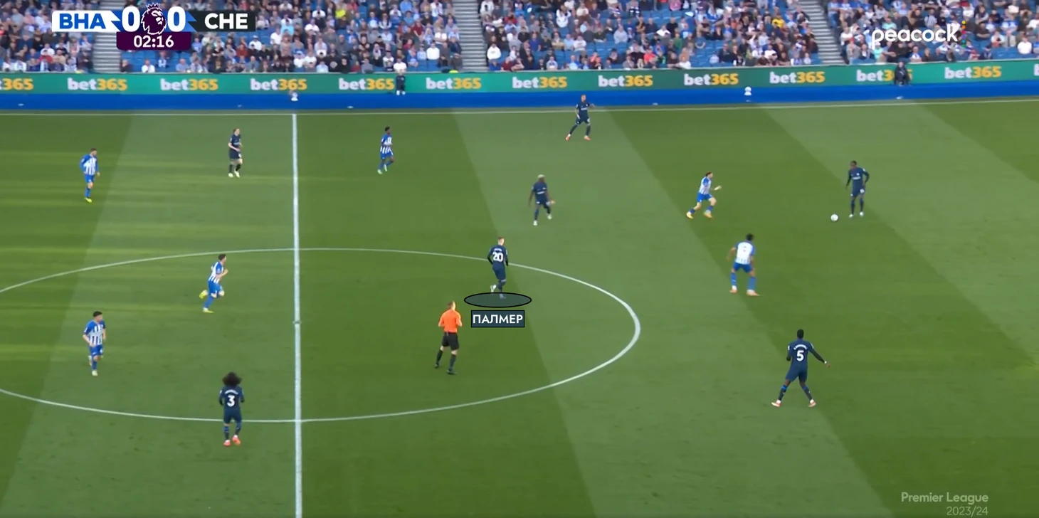 «Челси» защищался по схеме «4-4-2» – такая формация тоже привычна. Но в отличие от «Брайтона», гости отходили за центральный круг всем составом, не прессингуя защитную линию гостей. Джексон и Палмер старались работать с опорниками «чаек» – Гроссом и Гилмором.