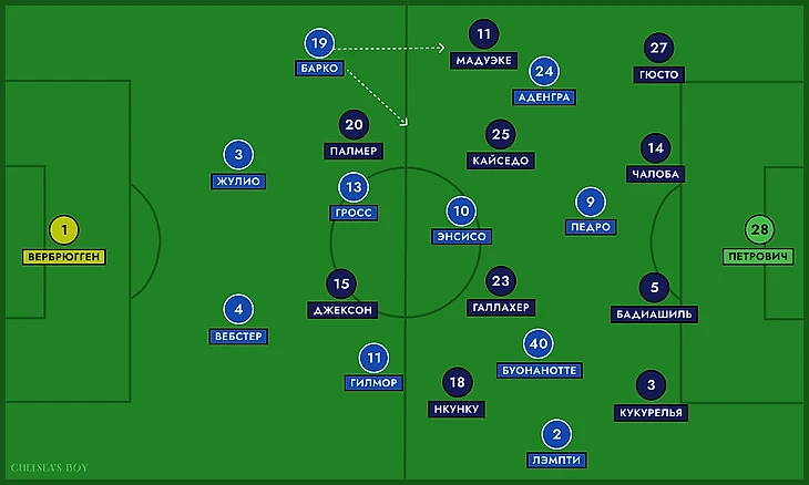 В итоге, на финальный отрезок матча Нкунку становится центрфорвардом, Чалоба уходит на фланг, а «Челси» играет в обороне по схеме «4-4-1».