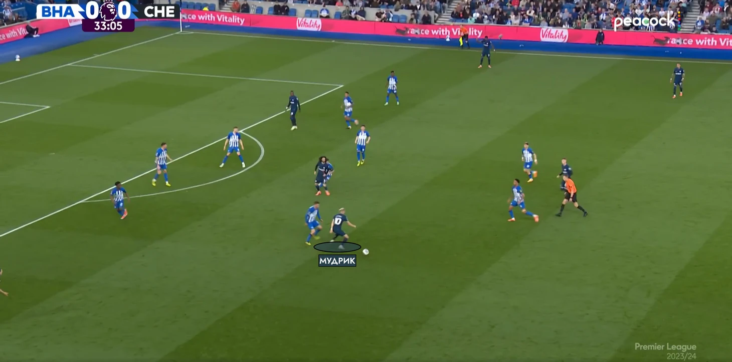 В начальной стадии я бы хотел выделить Мишу Мудрика. Украинец здорово выдернул из линии Паскаля Гросса, в зону которого и забежал Марк Кукурелья.
