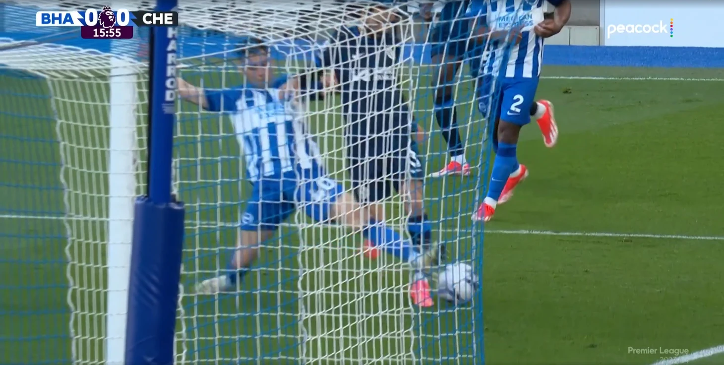 «Брайтон» потихоньку найдет лазейку в обороне «синих». В переходной фазе Марк Кукурелья не успеет вернуться на свой левый край, и Тарик Лэмпти опасно навесит в штрафную. Момент закончится ударом Педро в перекладину.