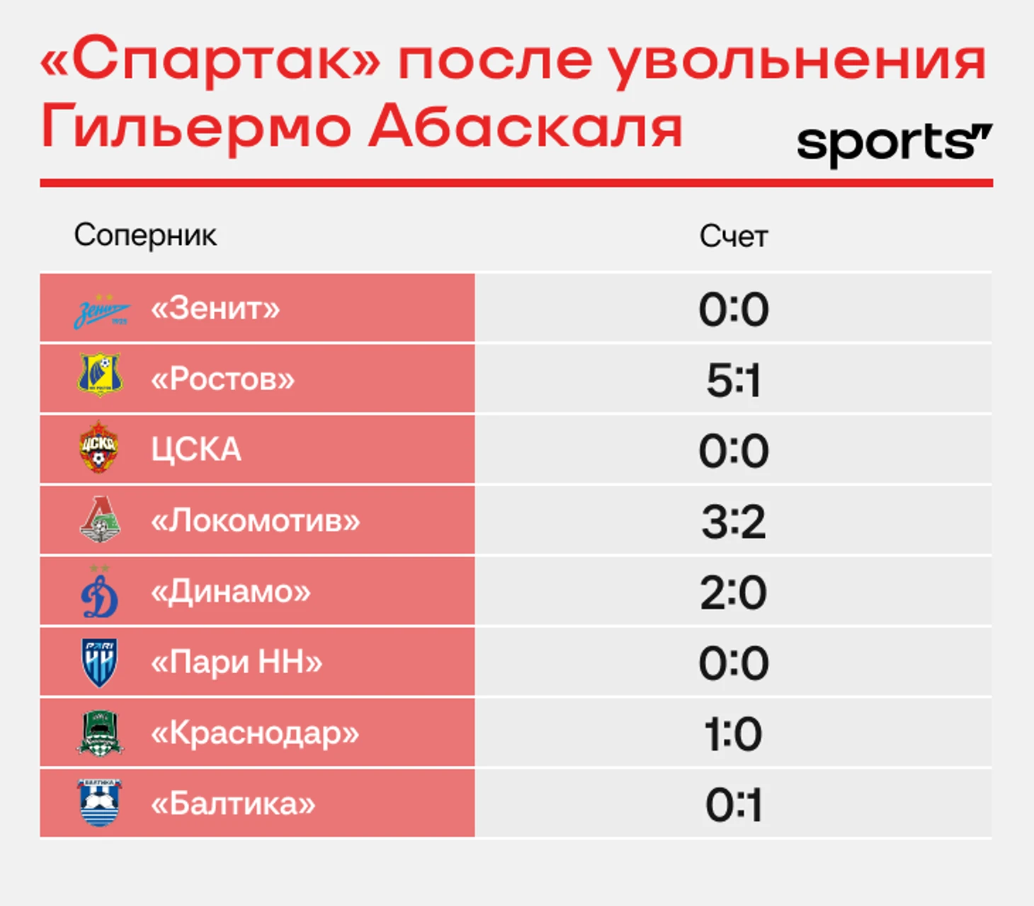 Тренер почти идеально прошел плотный отрезок – особенно на фоне неудач Гильермо Абаскаля с более простыми соперниками (провалы с «Факелом» и «Сочи», ничья с «Уралом», отскок с «Динамо»).