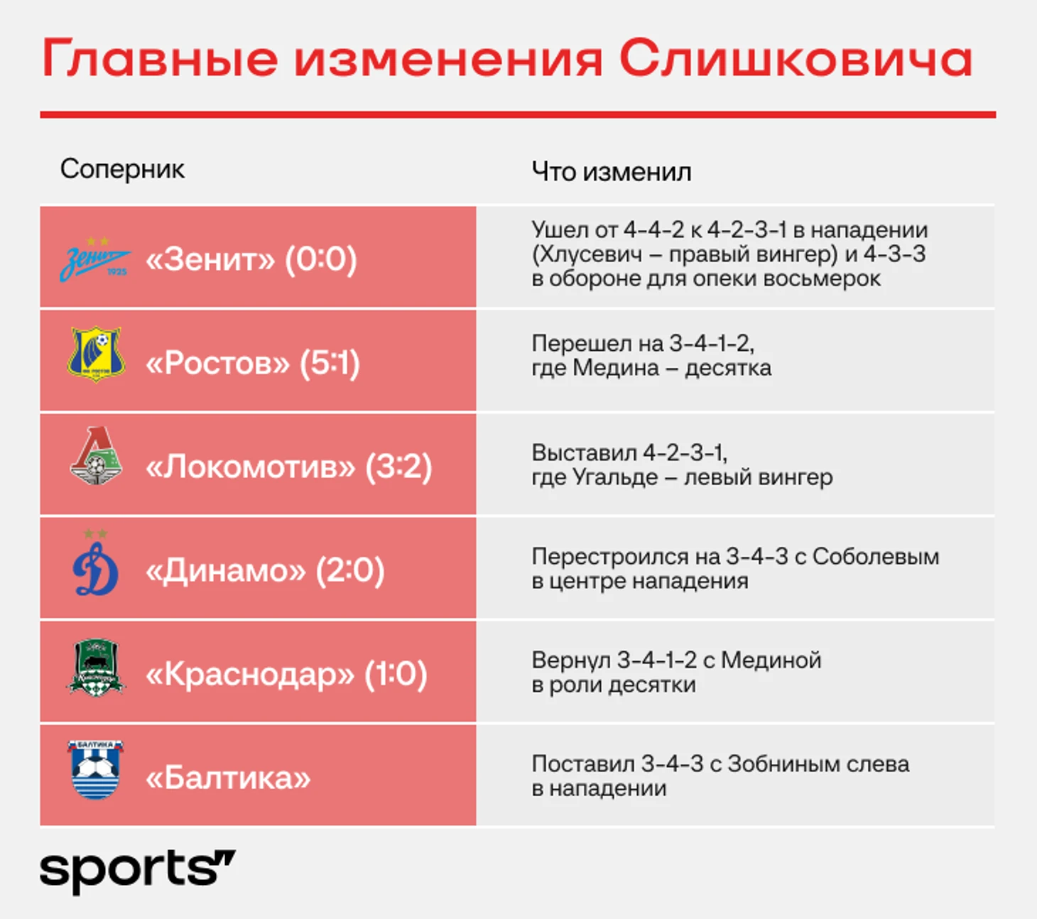 «Спартак» при Слишковиче ни разу не проиграл топ-командам: выстоял в Санкт-Петербурге (0:0), удачно сыграл в двух дерби из трех (победы над «Локо» и «Динамо», ничья с ЦСКА), смял разогнавшийся «Ростов» (5:1) и не пустил «Краснодар» на первое место (1:0).