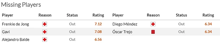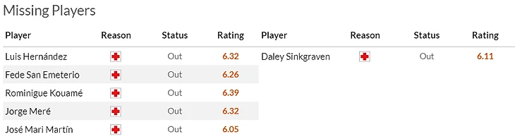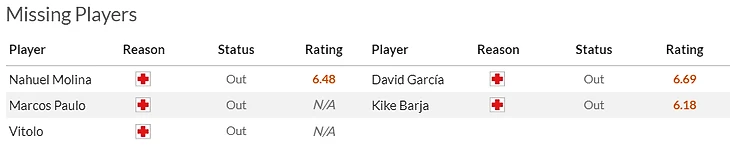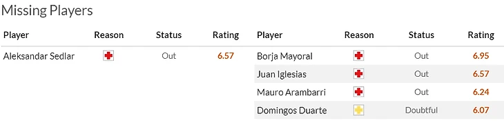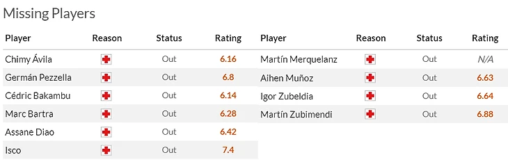 По симметричной причине пропустит игру с Реалом Кике Фемения(5,5). А участие Жерара Морено(8), Педрасы(6), Альбиоля(5,5) и Коклена(6) до сих пор под вопросом.