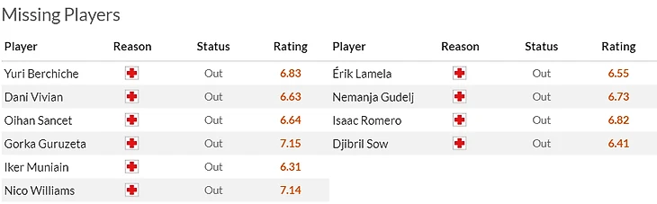 Что касается этого тура, то в нем помогать Унаю сохранять мощную статистику будут поправившиеся Вивиан(5,5) с Берчиче(6) и отдохнувший Де Маркос(6). Кроме того в общей группе замечены Сансет(7,5), Нико Уильямс(7,5) и даже Икер Муниаин(7,5). Наверняка выйдет на прощание.