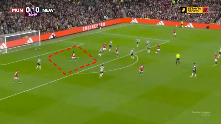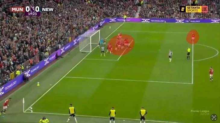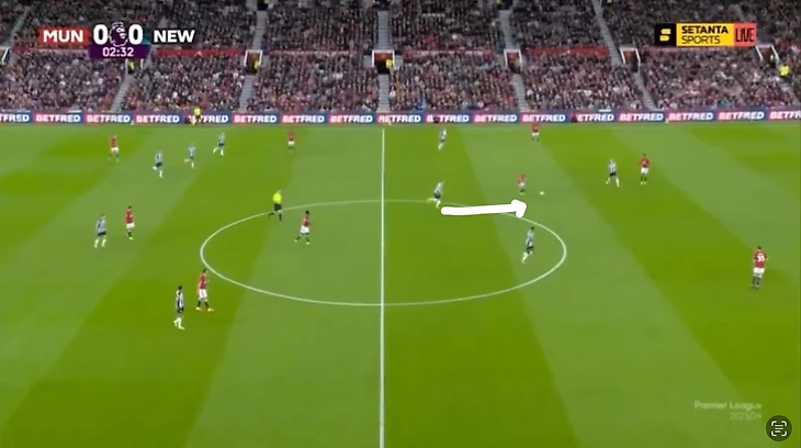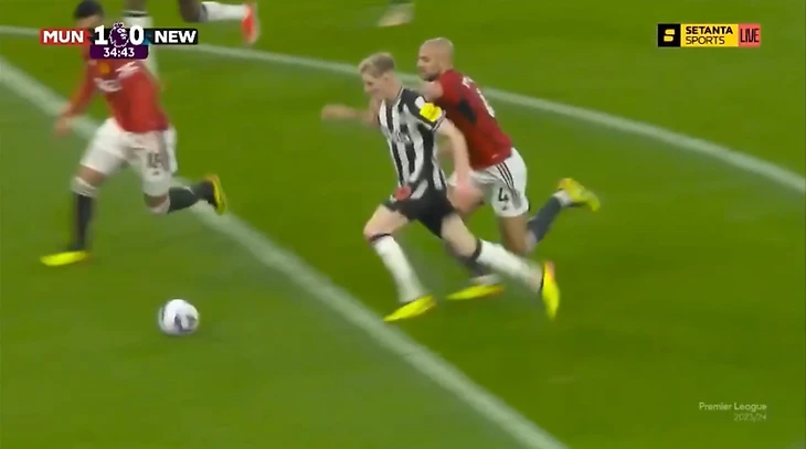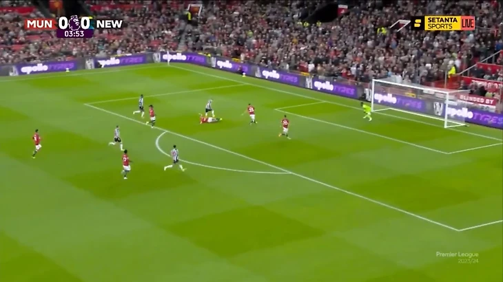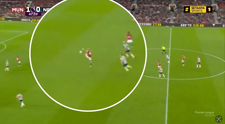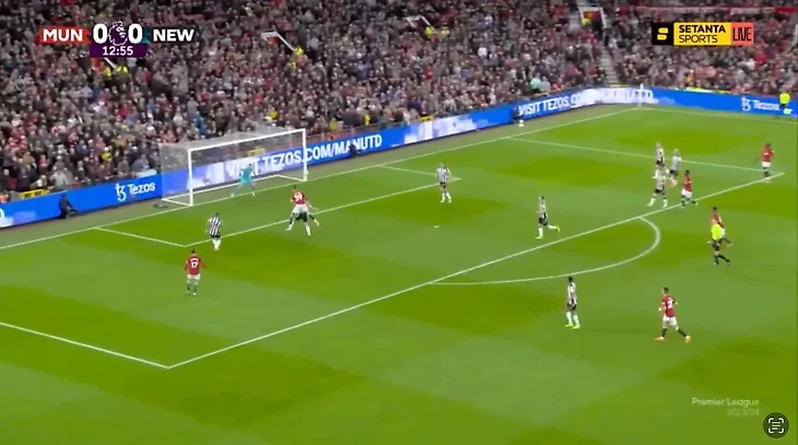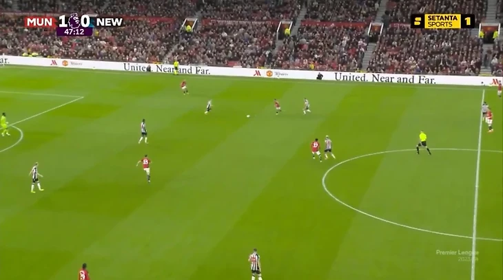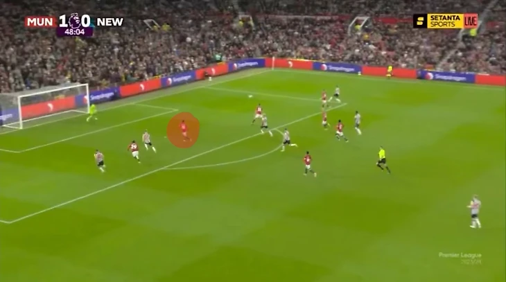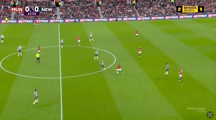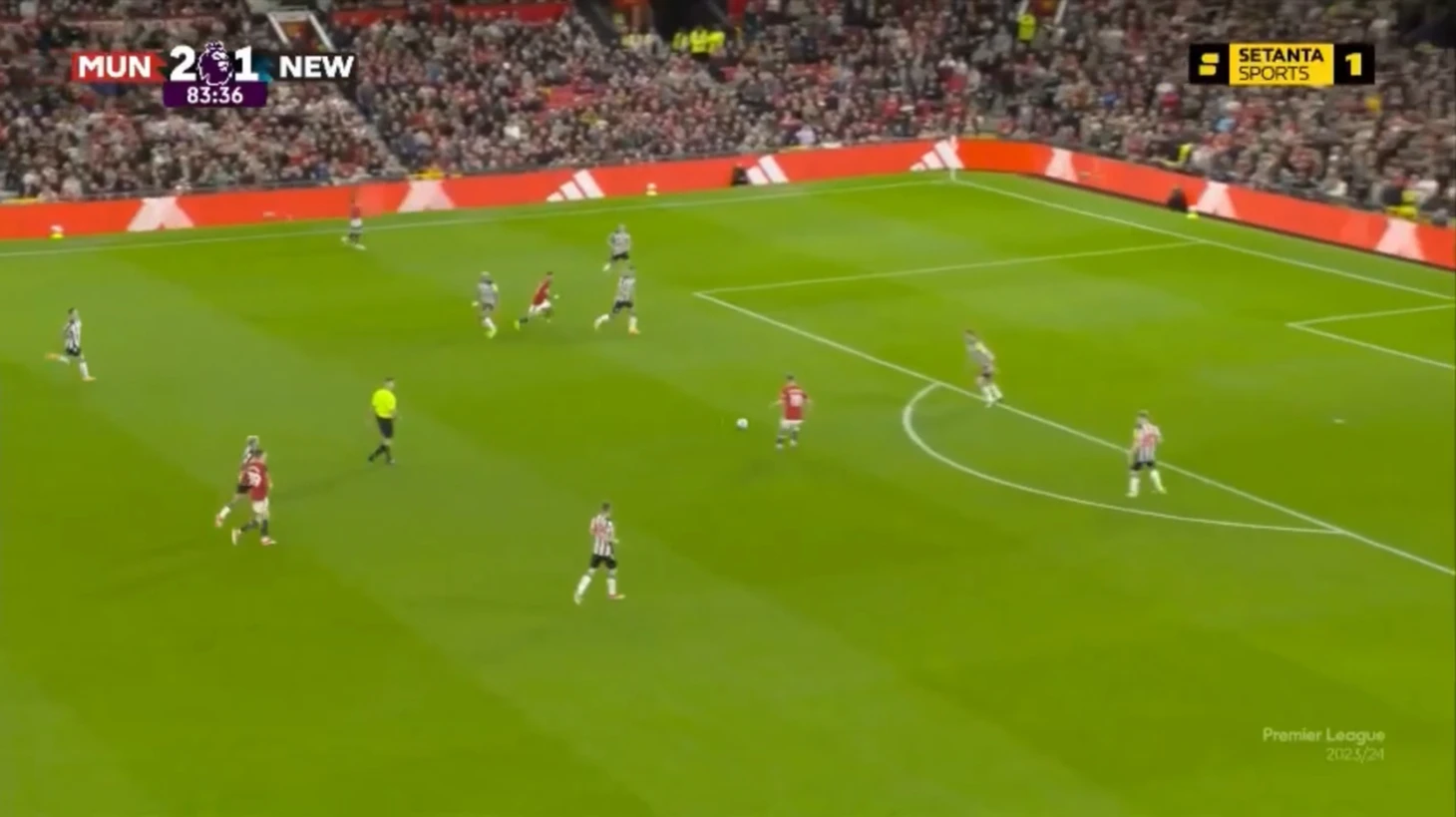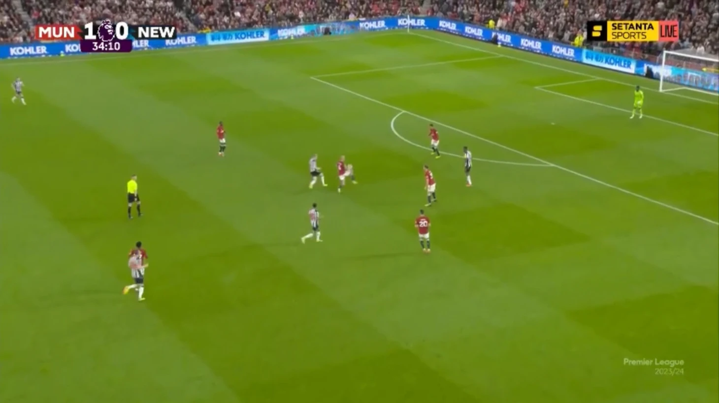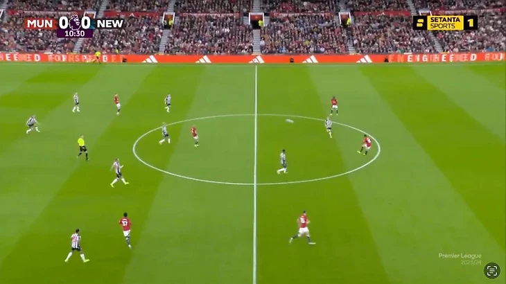 Тен Хаг продолжает искать сочетание игроков, чтобы закрыть проблемные из-за травм позиции, а также чуть эксперимента никто не отменял. Ну вот на этот матч была пара центральных Каземиро и Эванс, как и в прошлом матче, но в центре полузащиты вышел Амрабат. В качестве эксперимента Тен Хаг решил выпустить МакТоминея на форварде. Ну начнем с Амрабата, плюсом этого решения было то, что данный товарищ очень крут по игре в обороне, он всегда добегает, дорабатывает, а самое главное, он мог страховать авантюрного Каземиро, который играл в центре защиты, что периодически и получалось как вот тут.