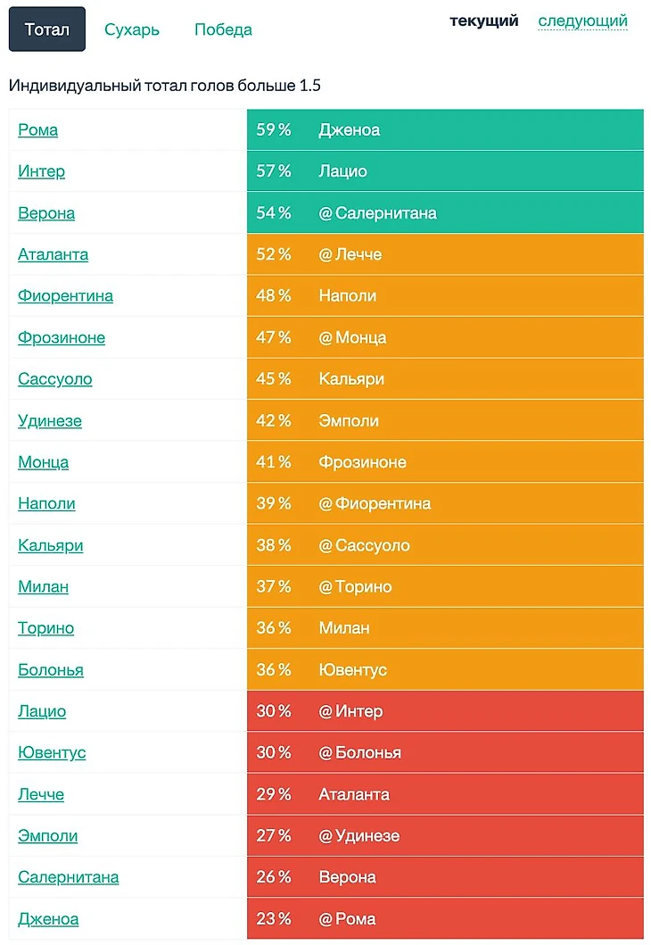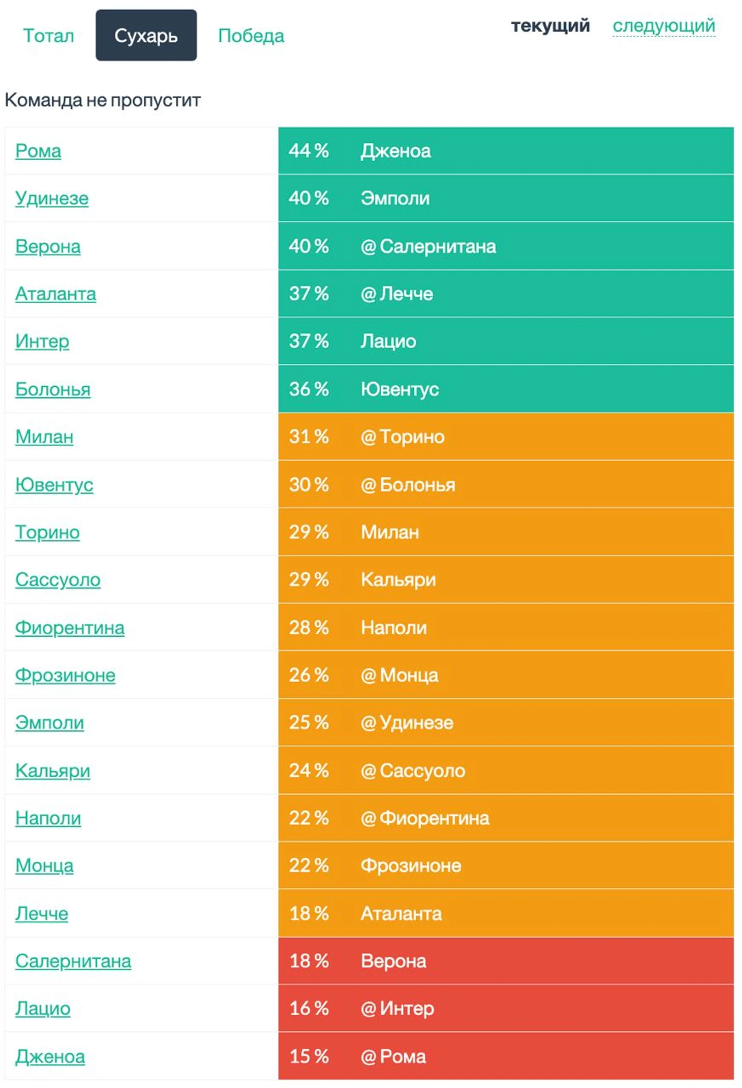 Сначала идут прогнозы на команды (НЕЛЬЗЯ УКАЗЫВАТЬ ОДИН И ТОТ ЖЕ КЛУБ ДВА ИЛИ ТРИ РАЗА): 1) Какая команда НЕ из топ-6 (т.е не Интер, Милан, Юве, Рома, Лацио, Наполи) засушит (+4 балла). Если выбранная команда пропускает 2 или более голов, то -1 балл.