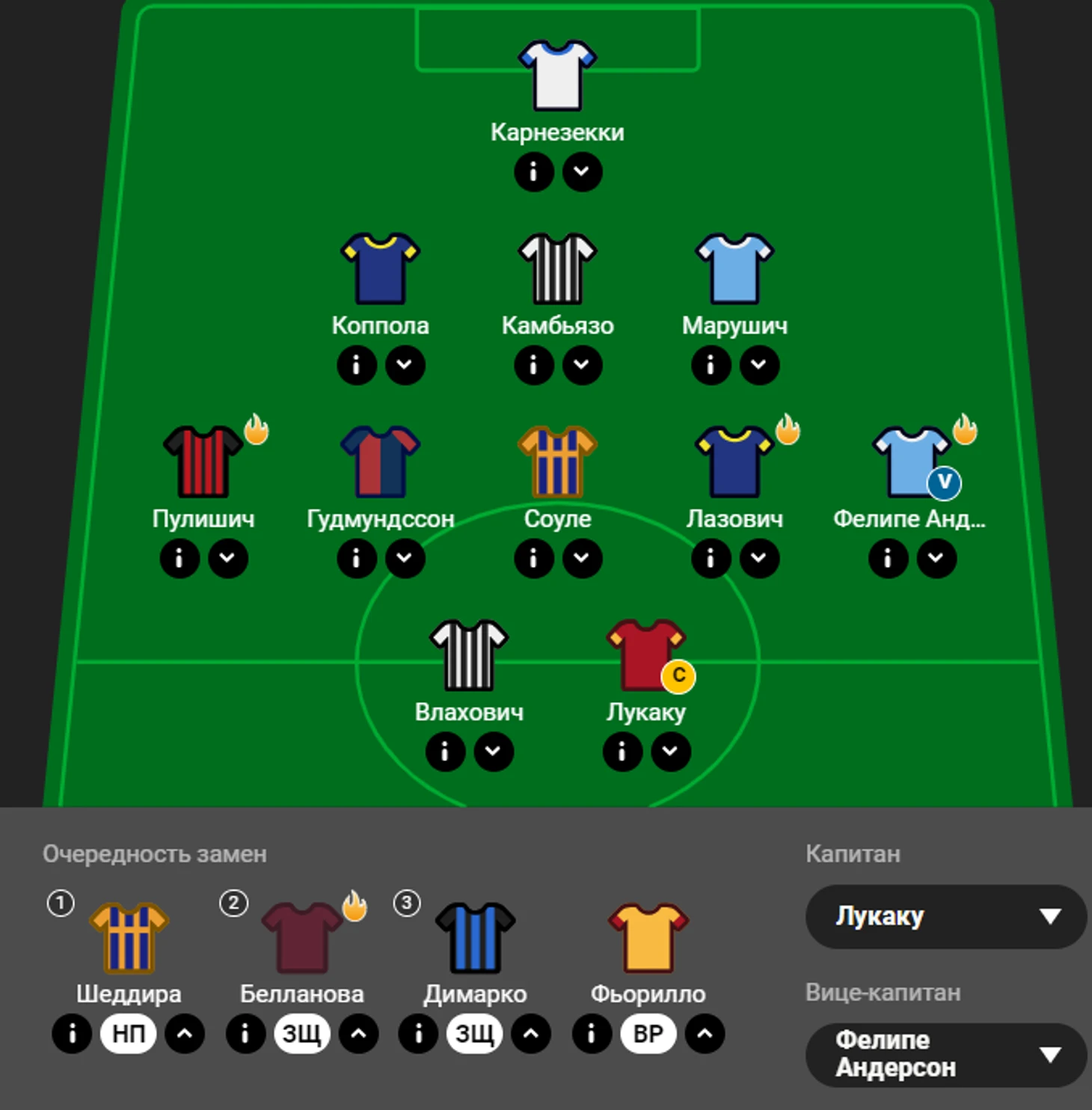 Взял двоих из «Вероны» и Лукаку. Возможно, ещё передумаю. Состав явно неоптимальный, захотелось поверить в римских орлов против «Интера»,