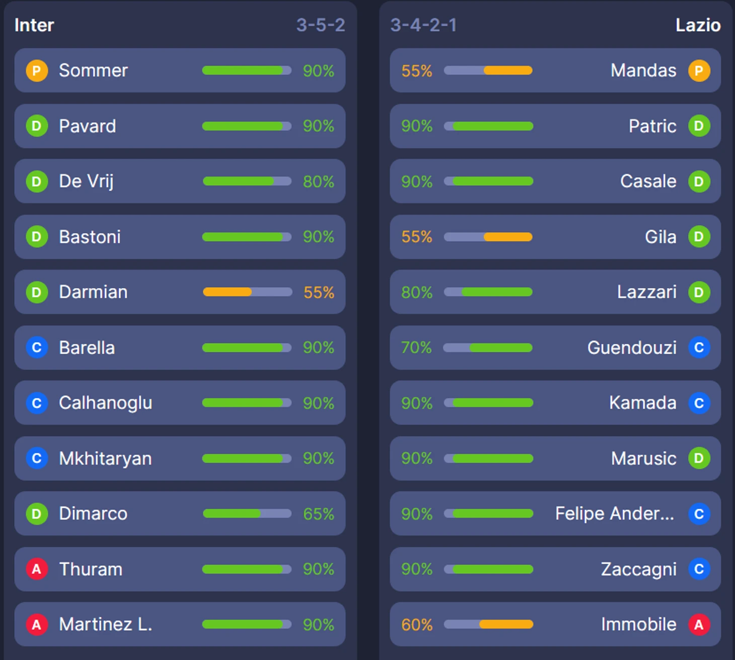 Важные нюансы: Димарко (защ, 6.5) может остаться в запасе, как и Фраттези (пз, 7). Нужно убирать Луиса Альберто - он не поможет гостям против чемпиона.
